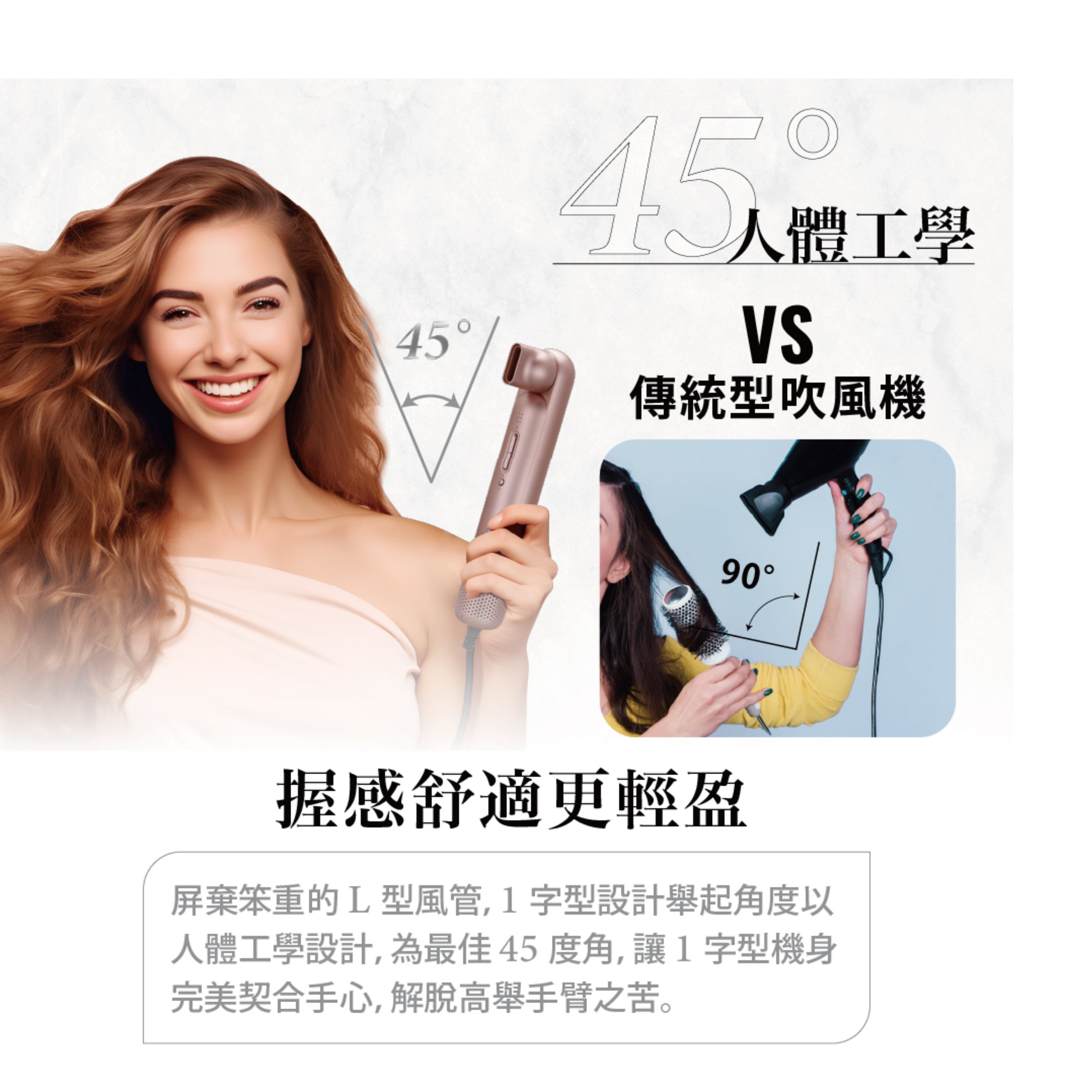 340g 超輕量機身 11萬轉 23 m/s 高風速 創新1字型設計 2億負離子 12種乾髮模式
