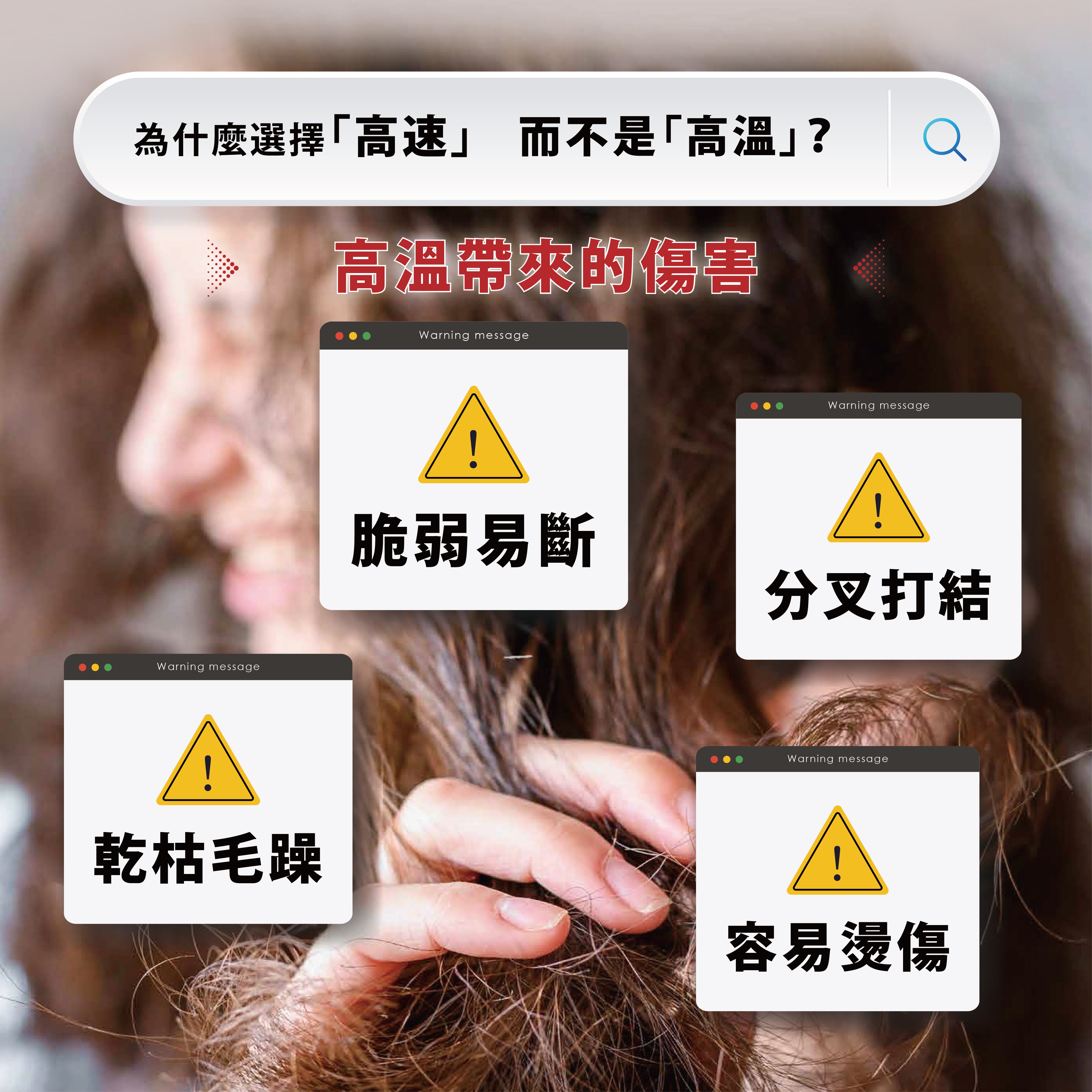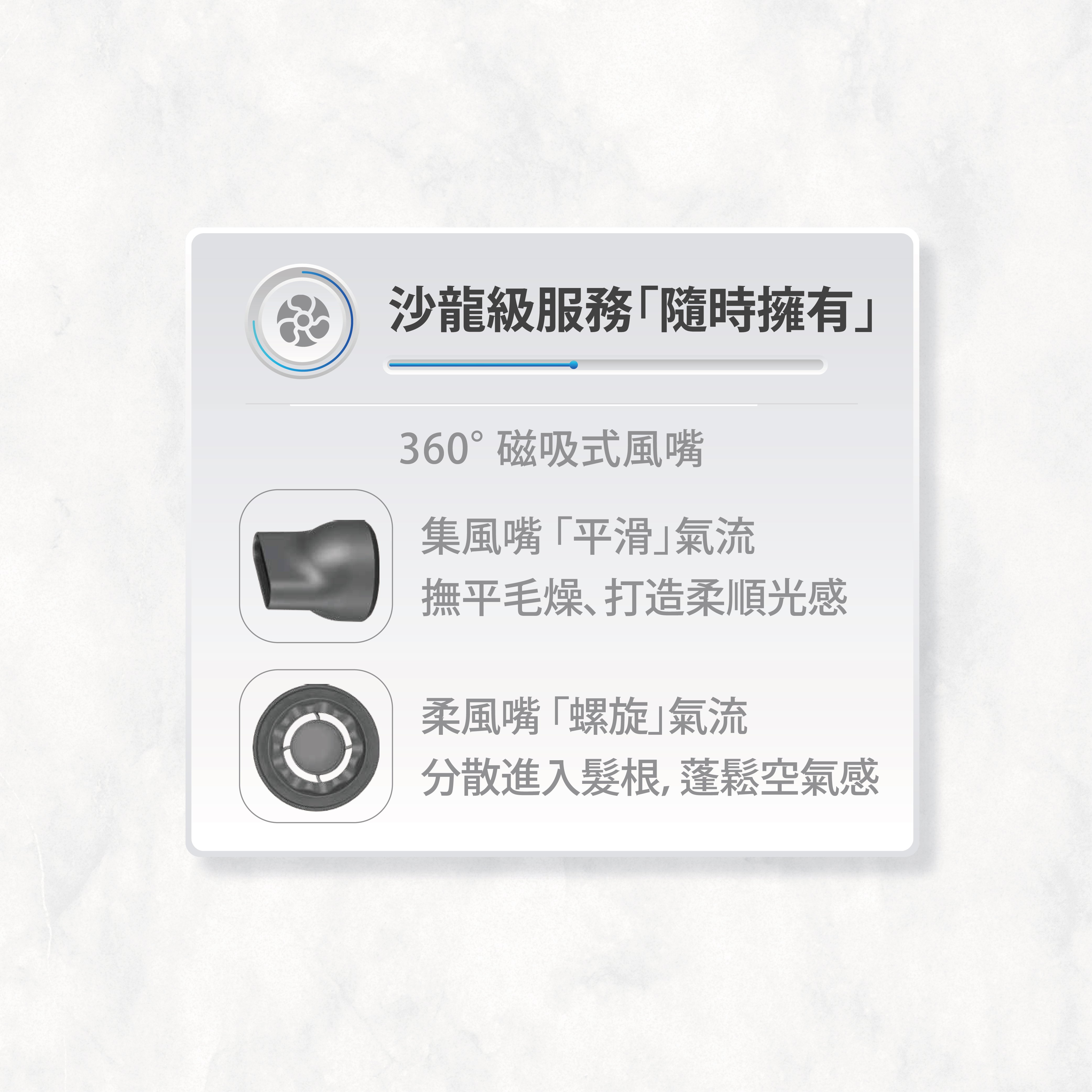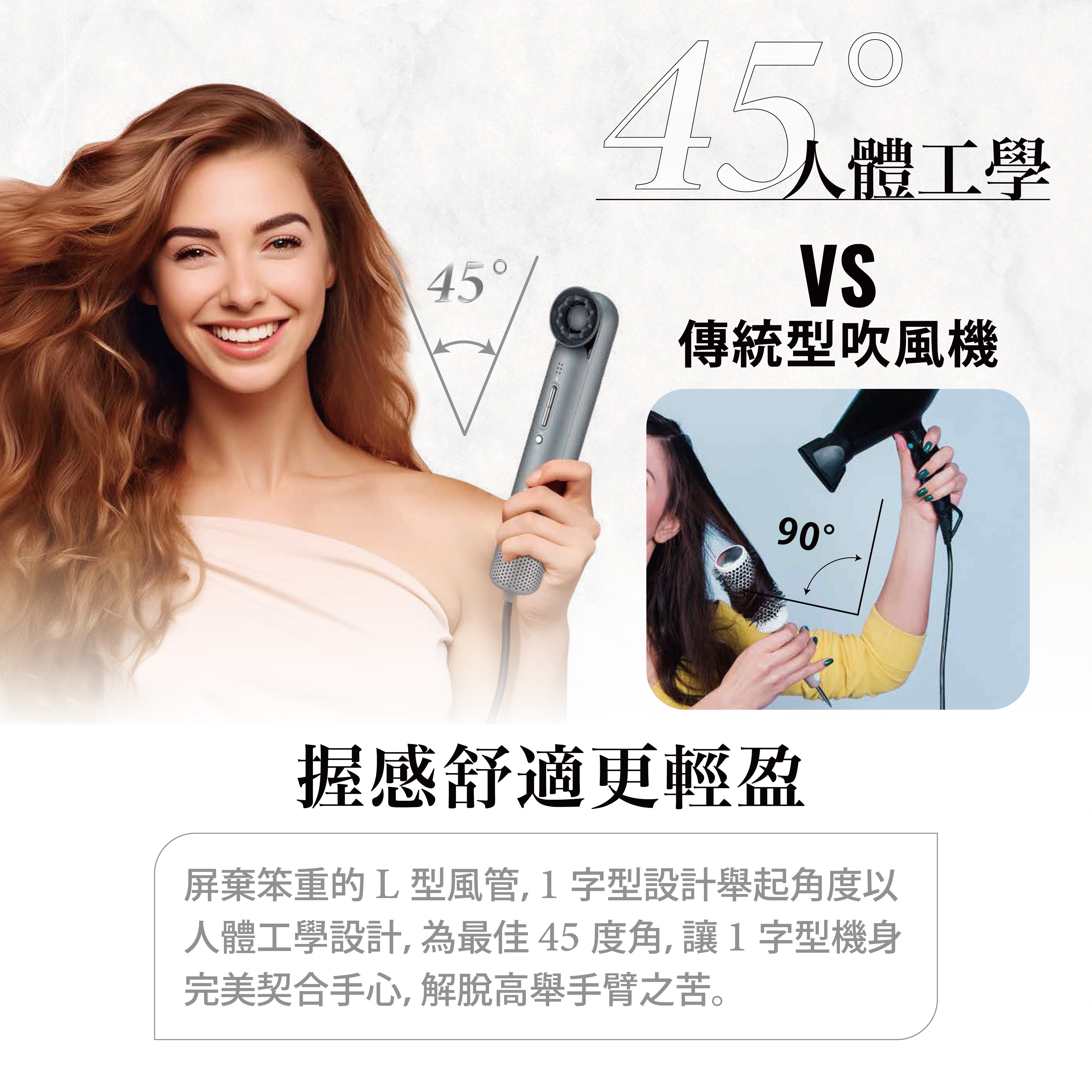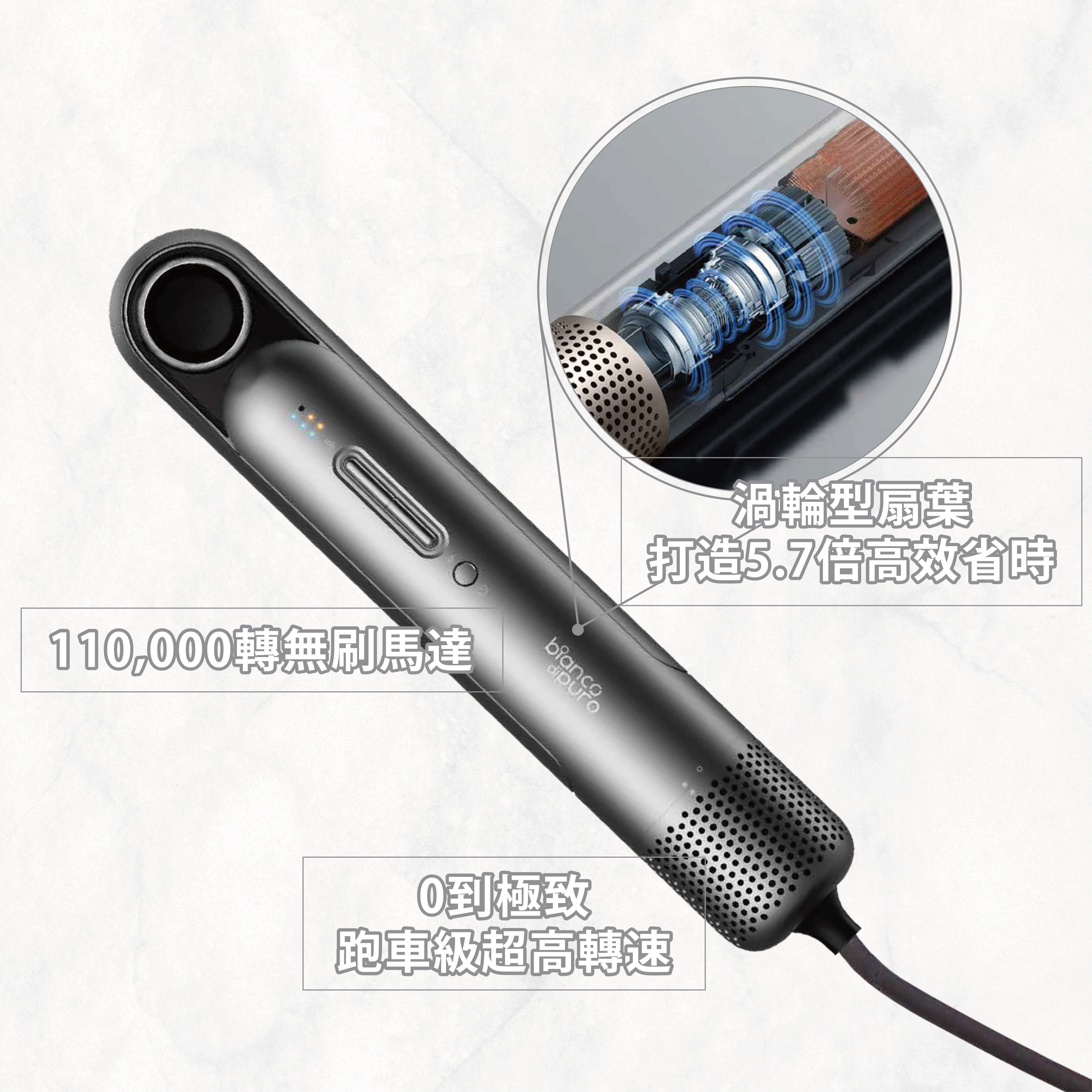 340g 超輕量機身 11萬轉 23 m/s 高風速 創新1字型設計 2億負離子 12種乾髮模式
