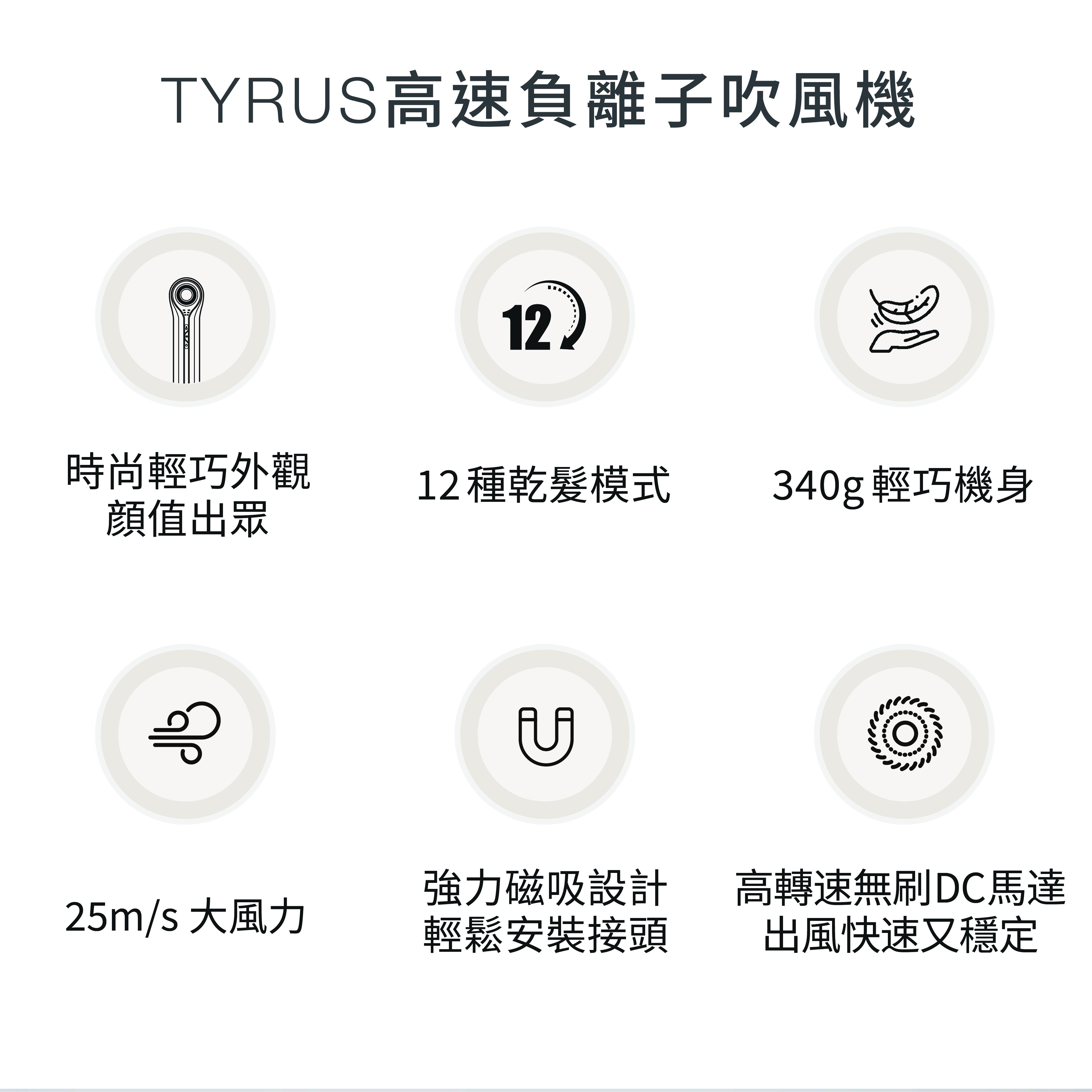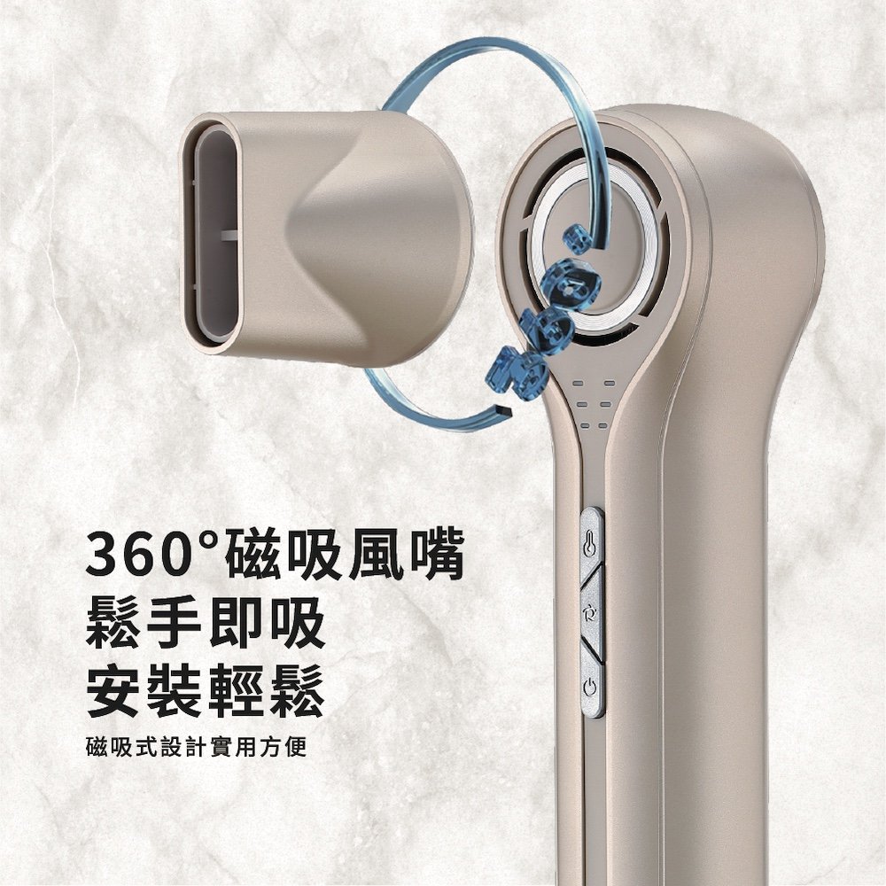 12種乾髮模式 340g輕巧機身 25m/s大風力,高速乾髮 360度磁吸式風嘴,一吸就牢,輕鬆更換 小巧方便,旅行好攜帶 富含2億負離子,柔順秀髮 11萬轉/分無刷電機,低風阻更高效 1200次/分智能控溫,呵護頭皮和秀髮 1字型設計,握感舒適更輕盈