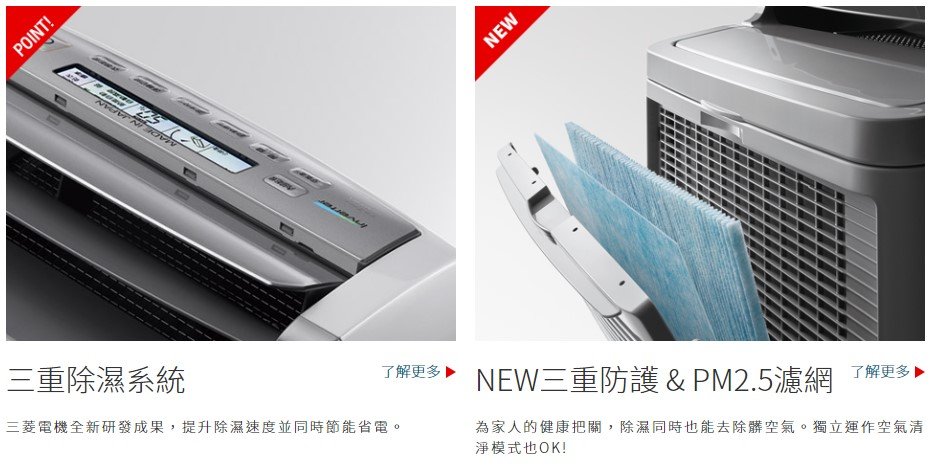 除濕能力19L/日創新三重除濕系統 凌駕業界最頂級「除濕力」與「省電力」-三菱首創三段式除濕新科技, 大幅提昇熱交換器的效率, 搭配新增旁通風路增加冷卻風量,