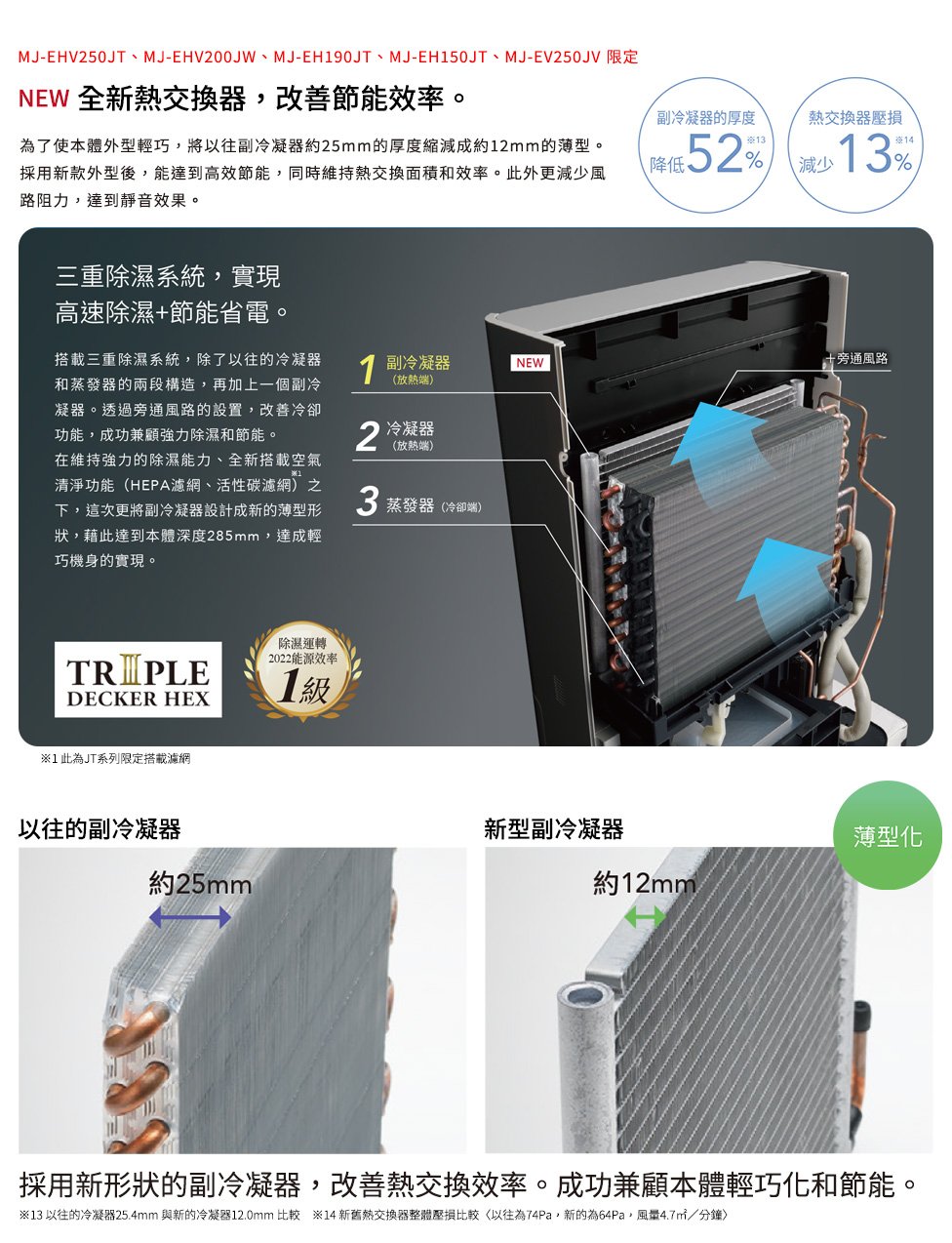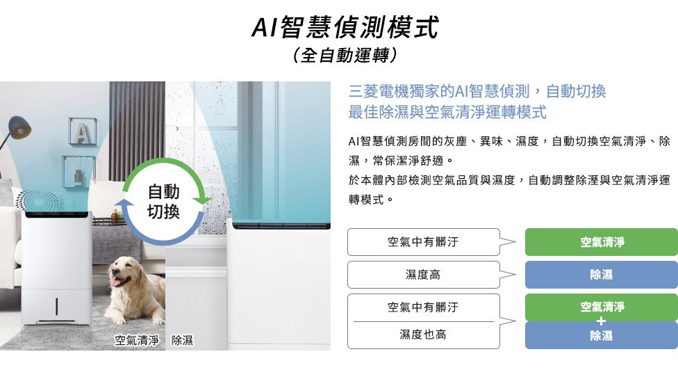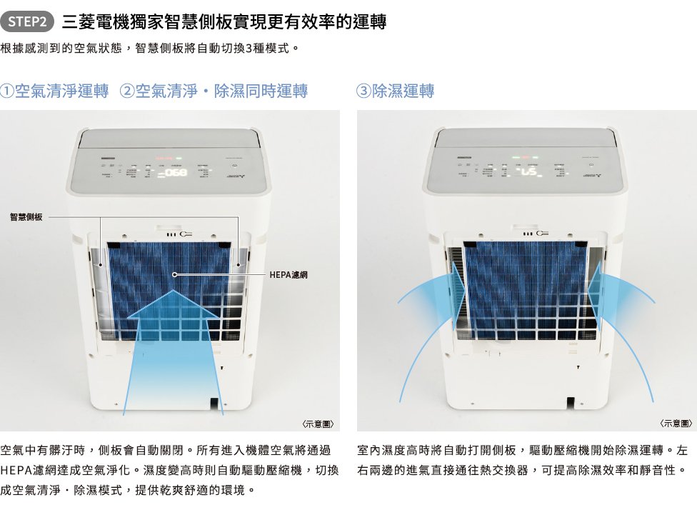 AI智慧偵測 強力除濕x快速空氣清淨x除臭 全自動切換運轉 - 濕度感應器自動感測室内濕度,異味感應器自動感測各種生活異味,高度粉塵感應器則自動感測細微懸浮粒子如PM2.5及PM1.0等,根據空氣狀況,自動切換3種模式。採用獨家三重除濕系統 兼具「除濕力」與「省電力」 - 使用三菱獨家最高規格三重除濕系統,採用新型薄型設計大幅降低冷凝器厚度,不但能維持熱交換面積與效率,也能減少風路阻力,達到靜音與省電的效果。