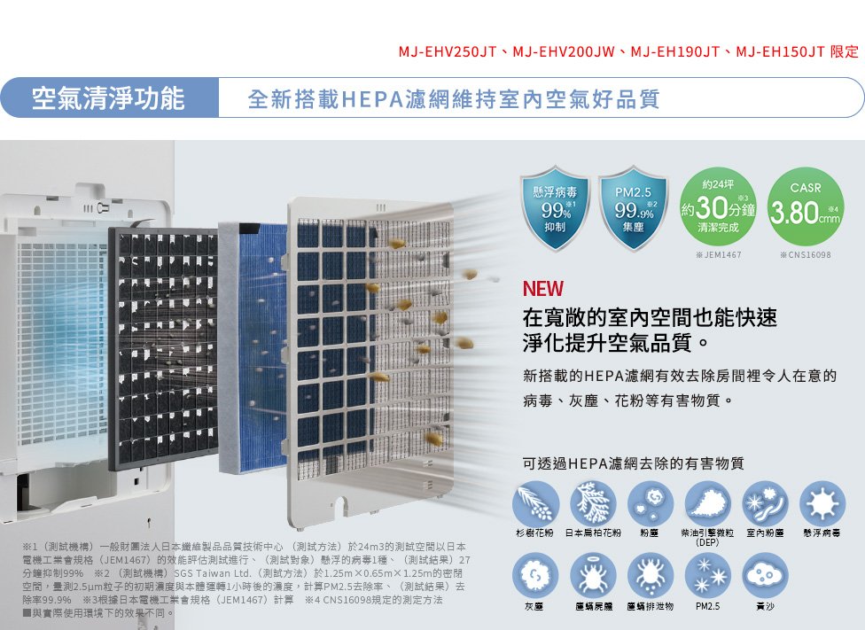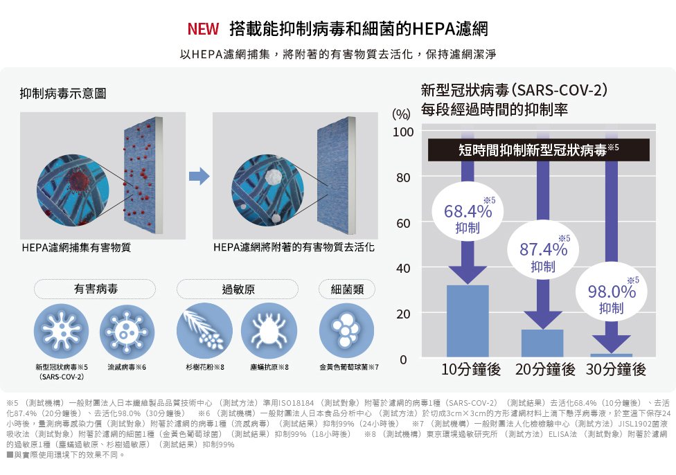 搭載HEPA+活性碳濾網 維持室內空氣好品質 - 搭載HEPA濾網+活性碳濾網,連細微的灰塵及病毒都能有效去除抑制,並有效去除異味。