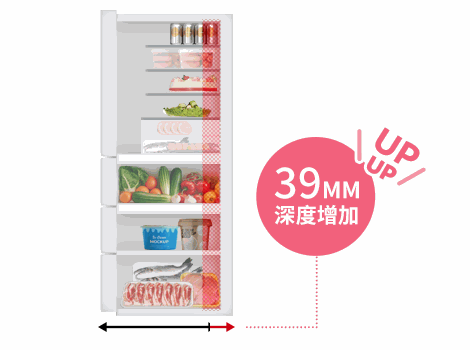 容量加大+雙冷凍室,高效能、更靜音,收納好輕鬆。深度增加 - 維持纖型尺寸,容量加大。