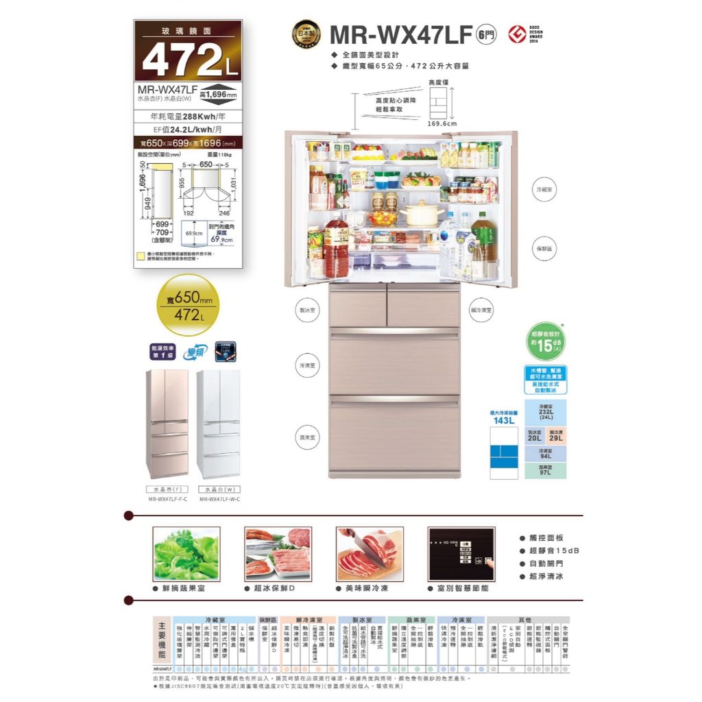 MITSUBISHI 三菱日製六門 472L 變頻玻璃鏡面冰箱MR-WX47LF