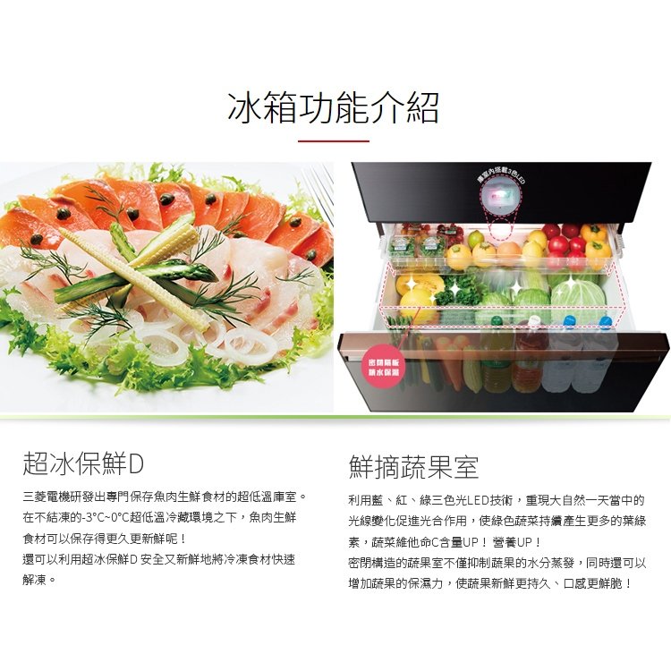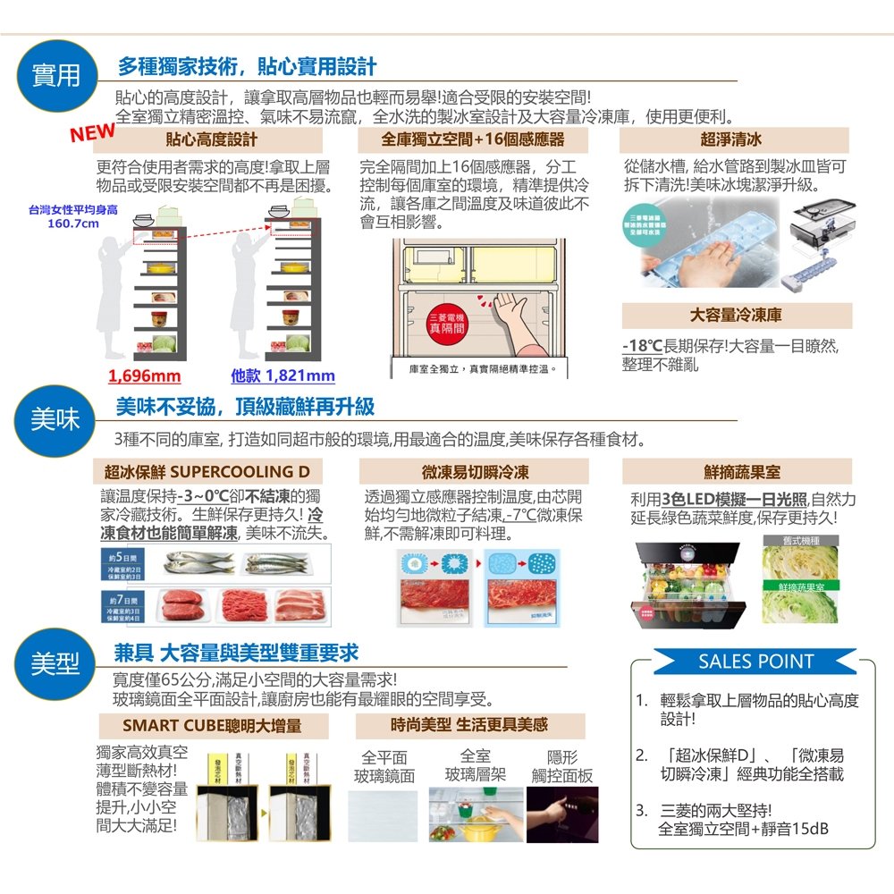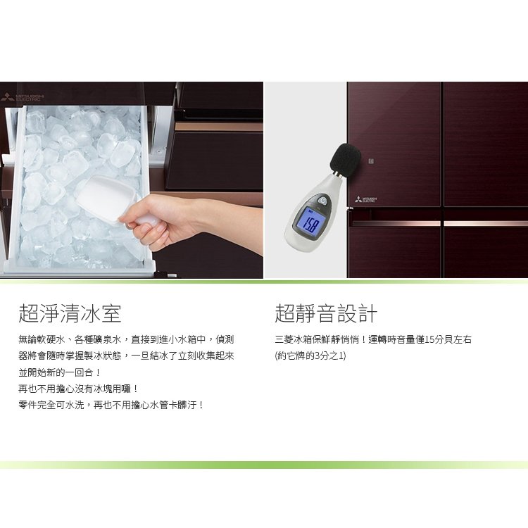輕鬆拿取上層物品的貼心高度設計! 「超冰保鮮D」、「微凍易切瞬冷凍」經典功能全搭載 三菱的兩大堅持!全室獨立空間+靜音15dB 多種獨家技術,貼心實用設計 美味不妥協,頂級藏鮮再升級 兼具 大容量與美型雙重要求