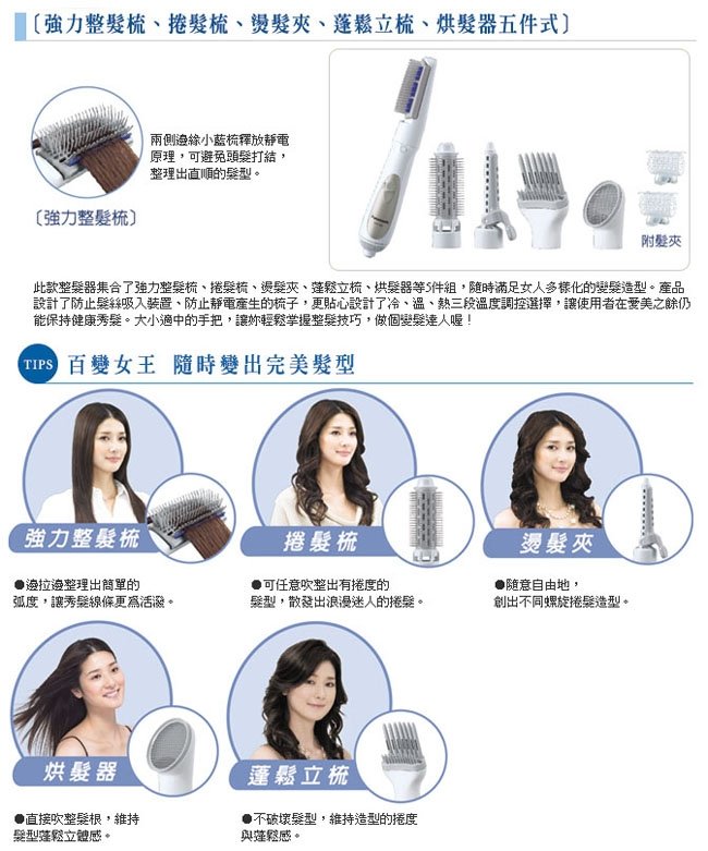 強力整髮梳、捲髮梳、燙髮夾、蓬鬆立梳、烘髮器 冷、溫、熱三段溫度 防止髮絲吸入裝置 防靜電 超靜音裝置(57dB)