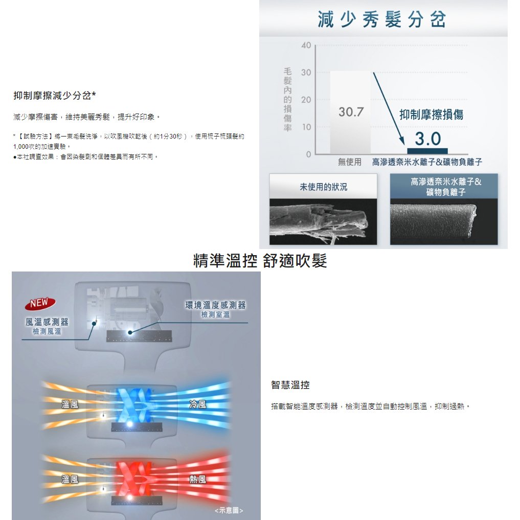秀髮超保濕-高滲透奈米水離子浸透髮絲,秀髮水分增加量提升1.9倍,即使髮尾也能感受到水潤。染髮護色、強韌秀髮-礦物負離子對抗染髮退色問題,降低紫外線及摩擦對秀髮的傷害。