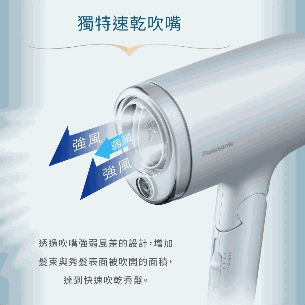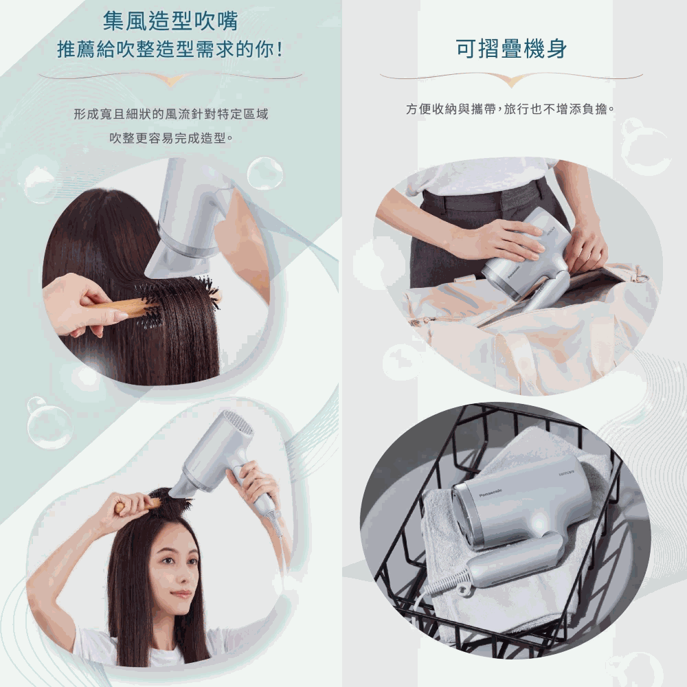 搭載奈米水離子 高溫防護模式 便利設計:搭載3段風溫和可折疊機身,輕鬆因應各種需求 nanoe 奈米水離子 集風造型吹嘴