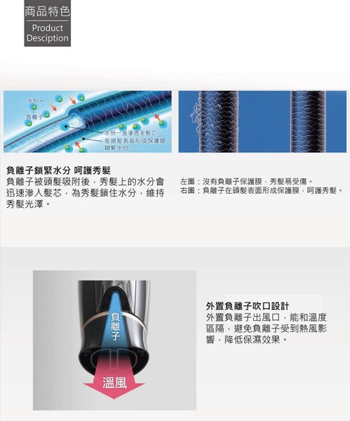 時尚晶鑽黑外觀 搭載速乾吹嘴 保濕負離子-吹頭髮同時為秀髮保濕 1400W.大風量-快速吹乾好省時