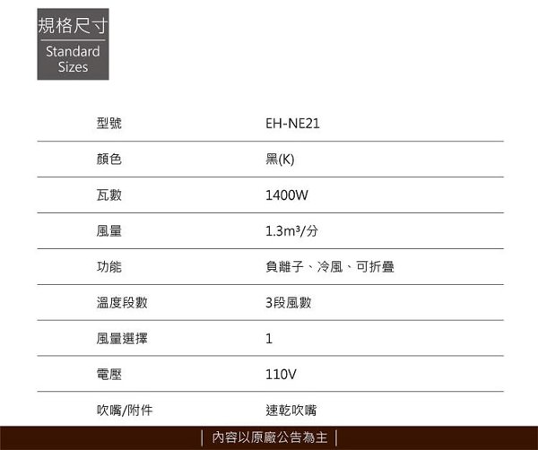 Panasonic 國際牌負離子速乾護髮折疊式吹風機EH-NE21