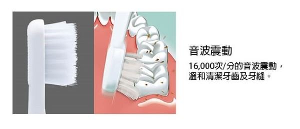 音波震動- 每分鐘16,000 次的音波震動,溫和清潔牙齒牙縫 極細毛刷頭 深入牙周袋清潔 輕巧設計 轉動式開關
