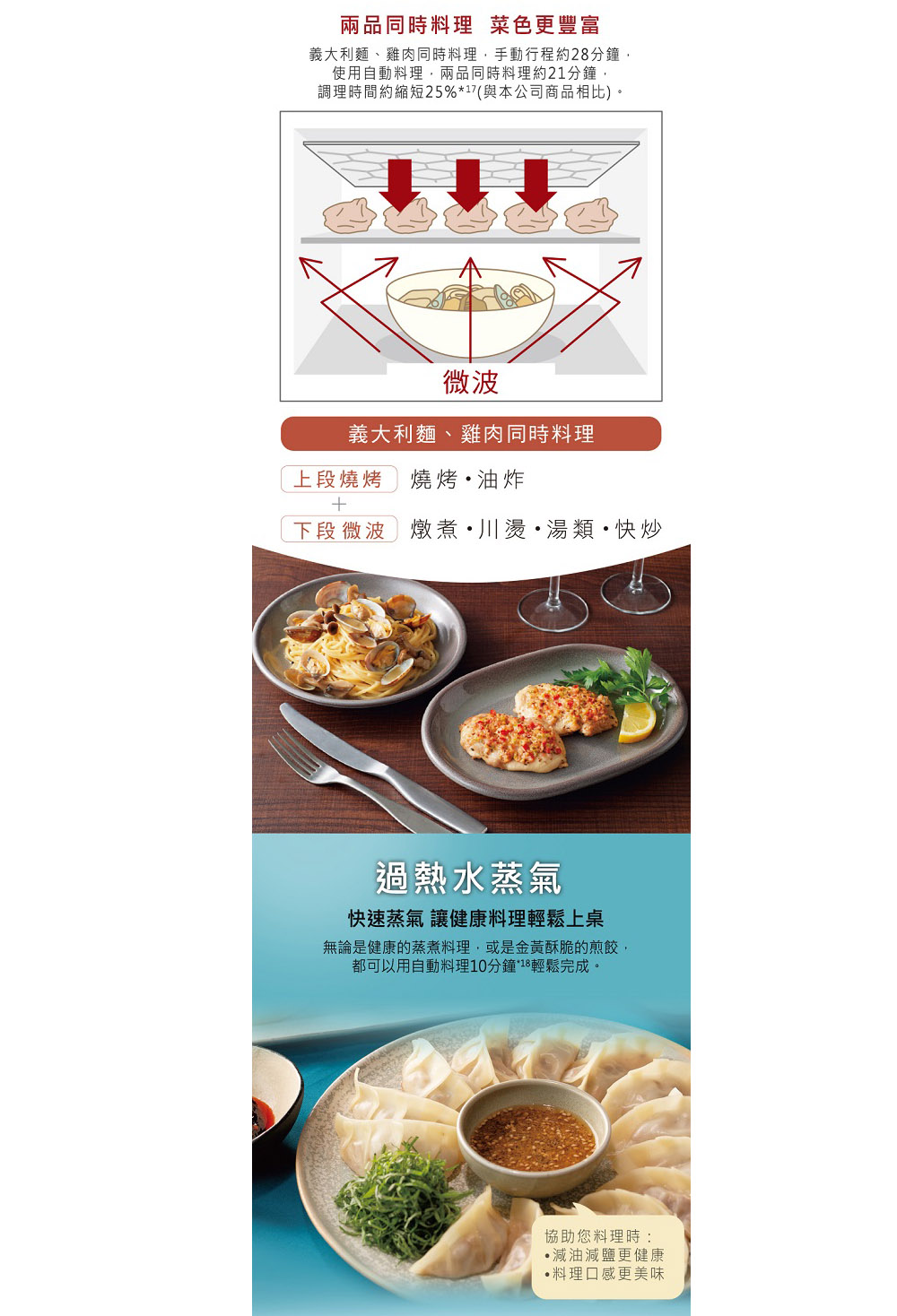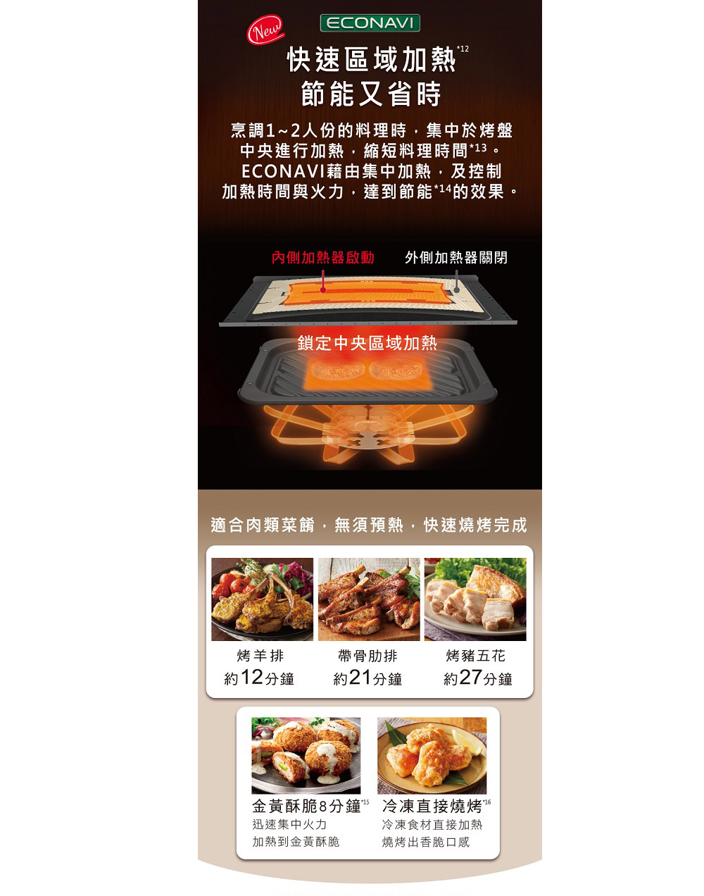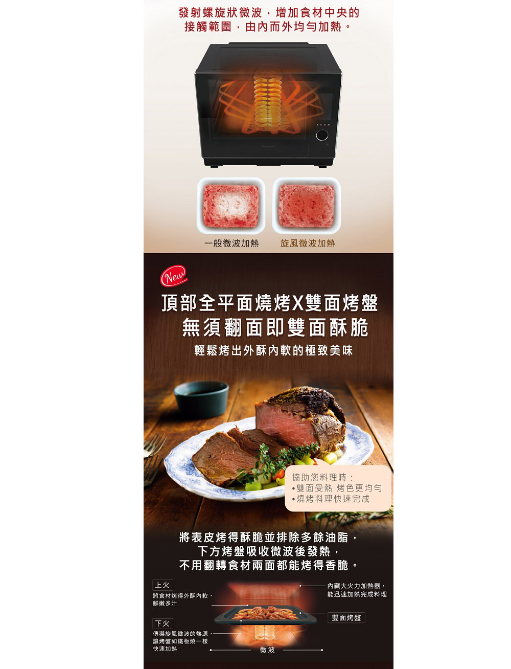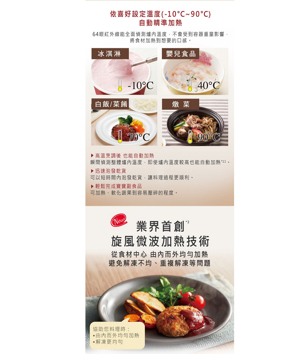 64眼紅外線溫控科技,業界唯一,瞬間偵測食材溫度,精準加熱旋風微波加熱技術,業界首創,由內而外,快速均勻加熱
