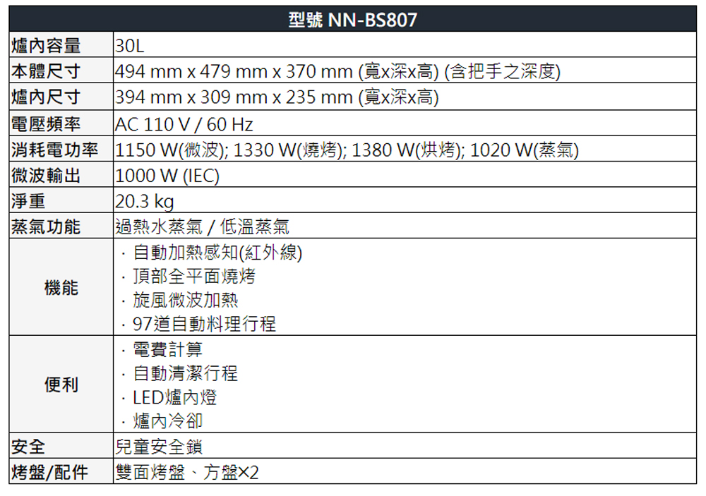 Panasonic 國際牌30L旋鈕平台式變頻蒸烘烤微波爐NN-BS807