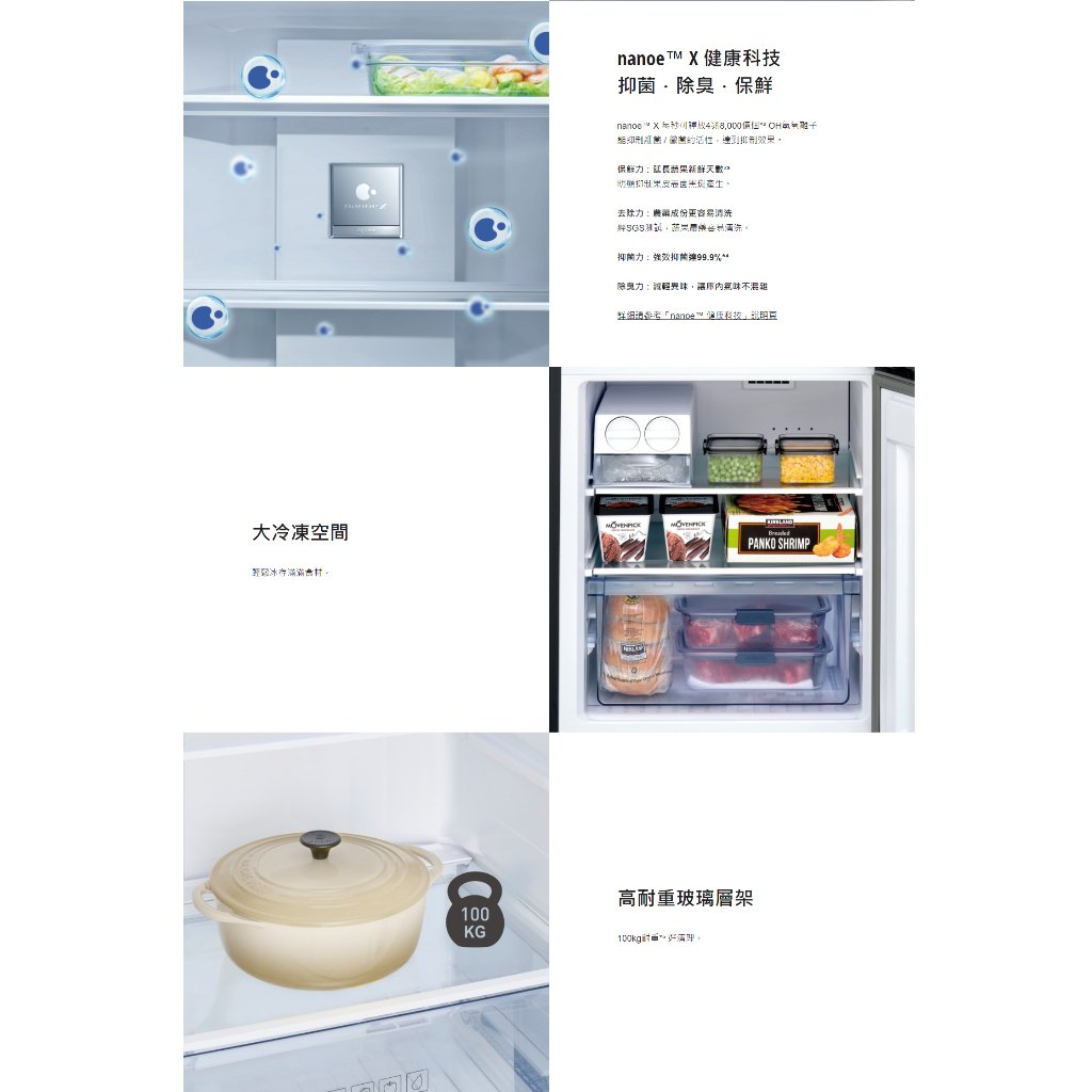 冷凍室大容量設計 冷藏室 LED照明設計 全室高耐重玻璃層架 全方位健康保鮮.抑菌.除臭.保鮮-nanoe X 急速冷凍行程