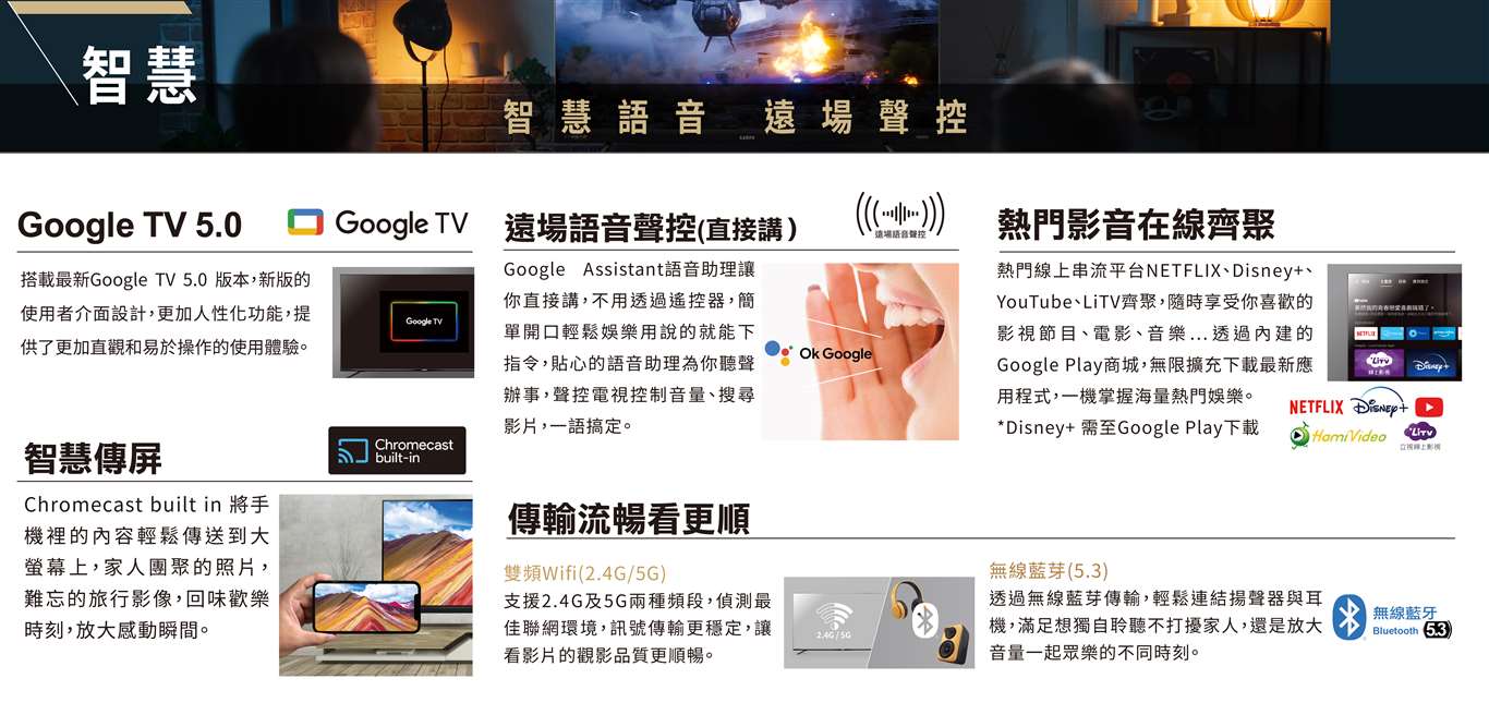 4K UHD Smart LED (Google TV 5.0)AI優畫技術 - AI影像自動優畫 NNSR Technilogy、 AI人臉優畫、立體景深強畫 、 物件辨識優畫 、 場景檢測優畫