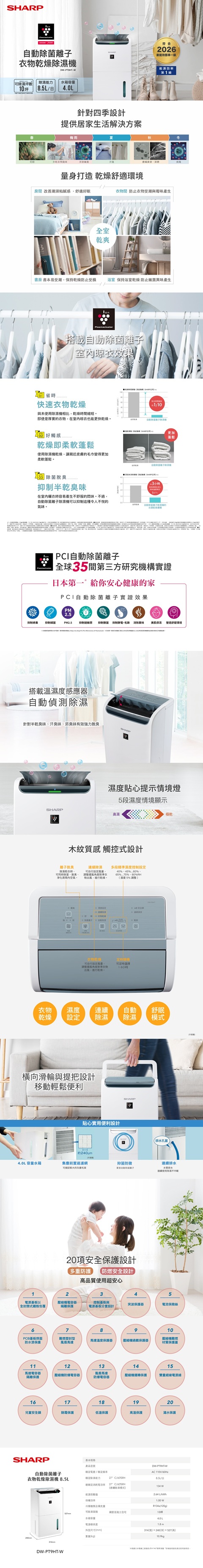除濕能力8.5L/日 (B式 /室溫27 ℃/相對濕度60%)Plasmacluster自動除菌離子除菌脫臭/定點脫臭