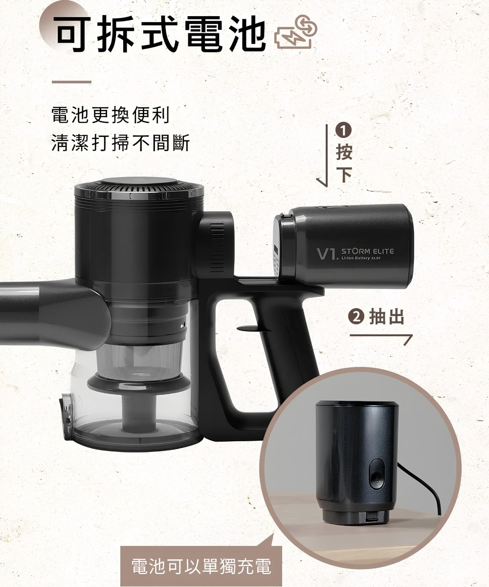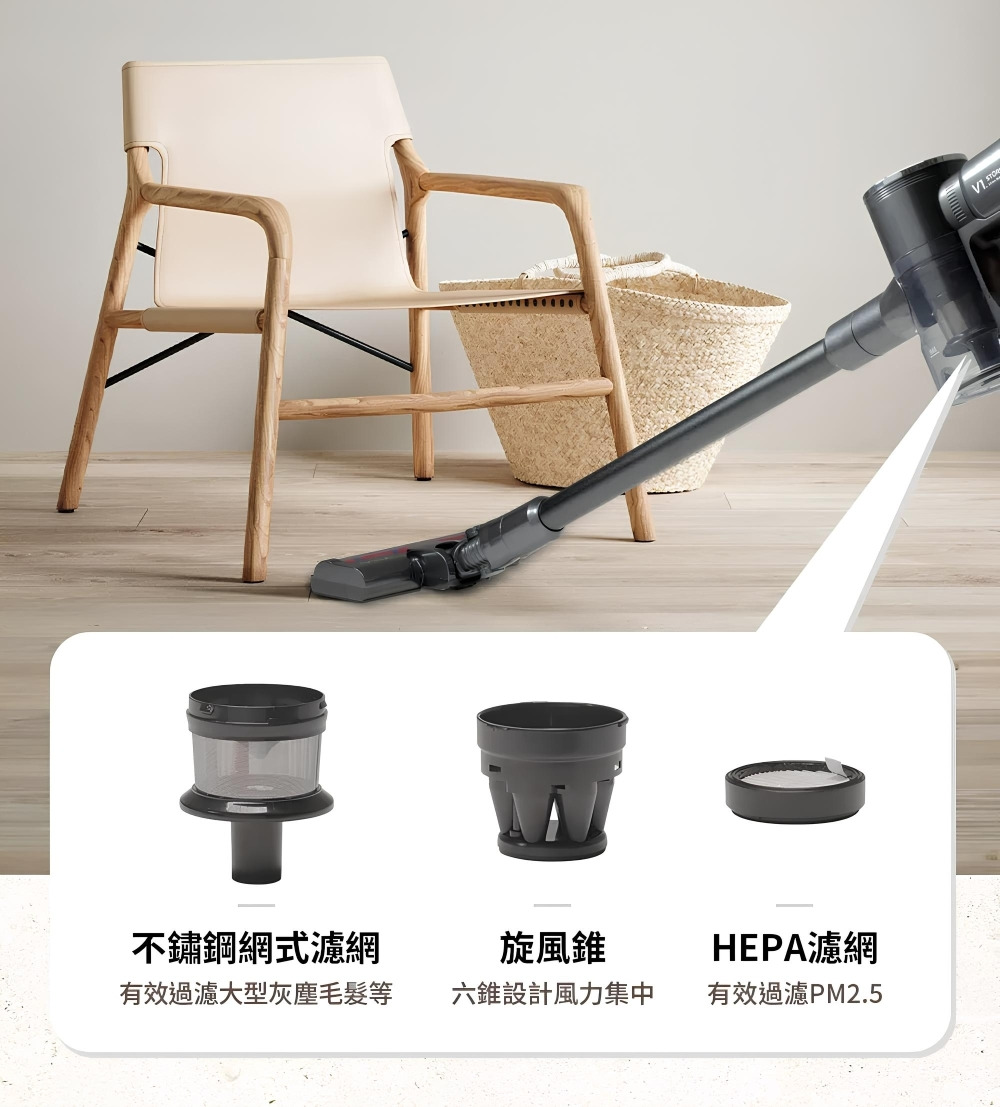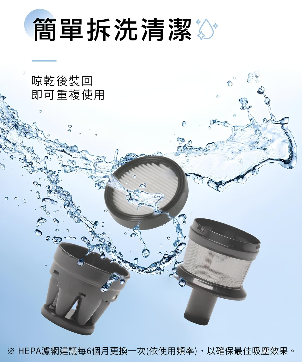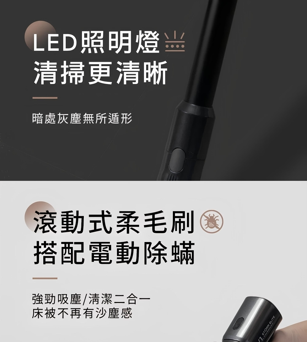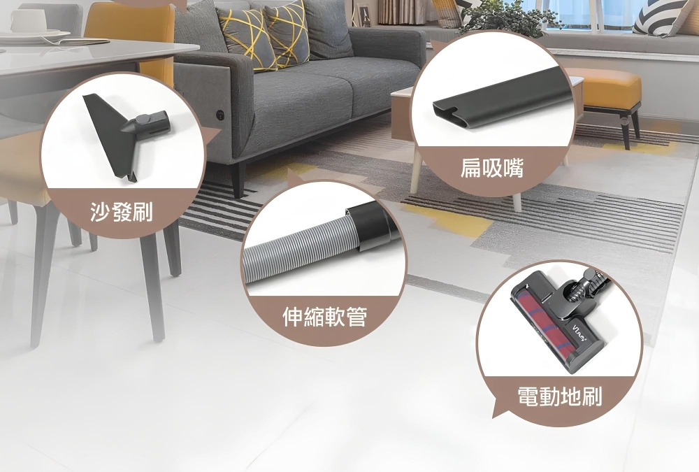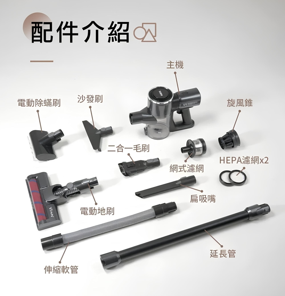 配件:LED電動绒毛地刷、電動除螨刷、金属铝管、 伸缩软管、二合一刷、扁吸嘴、沙發刷、HEPA濾網2個、壁掛固定架、產品收納座