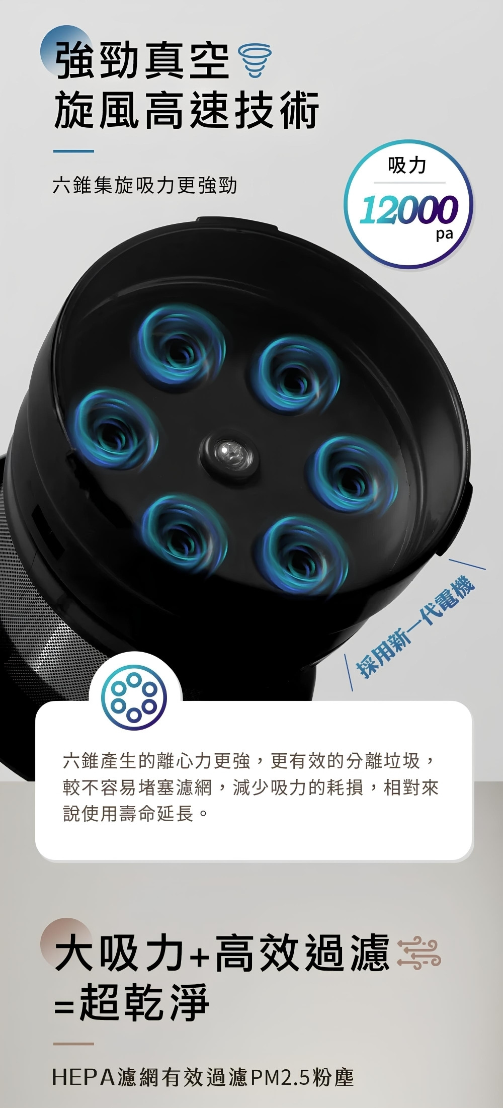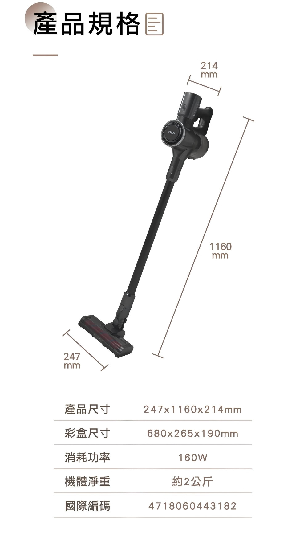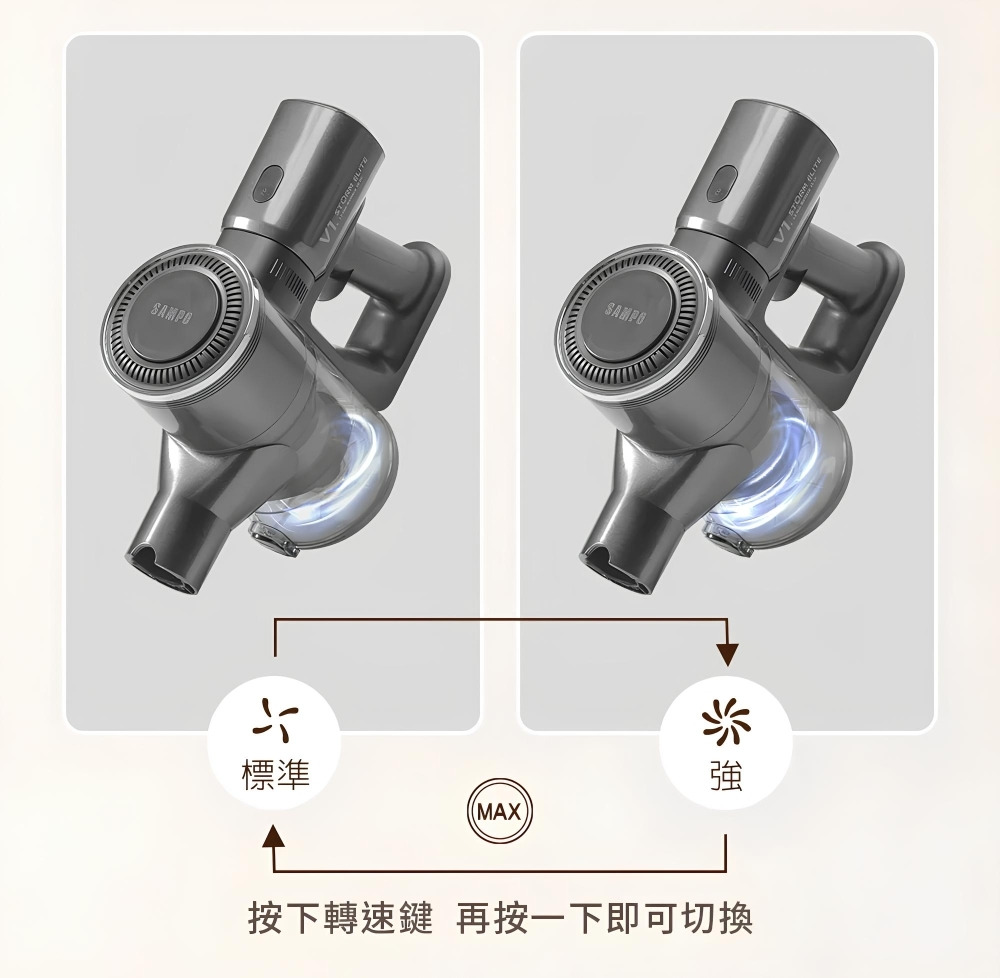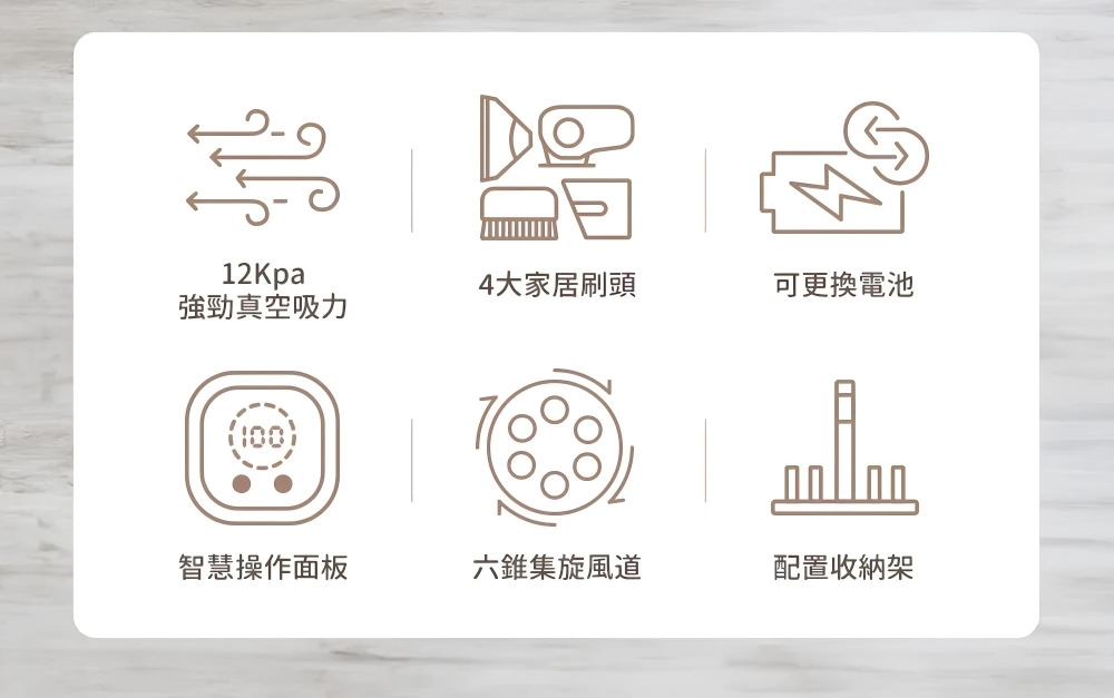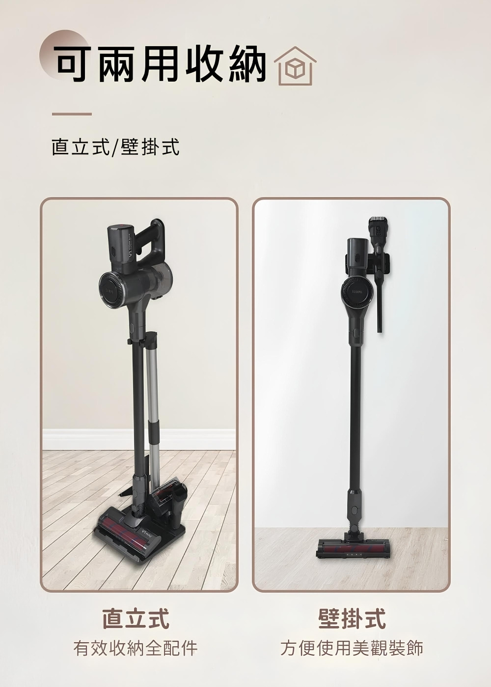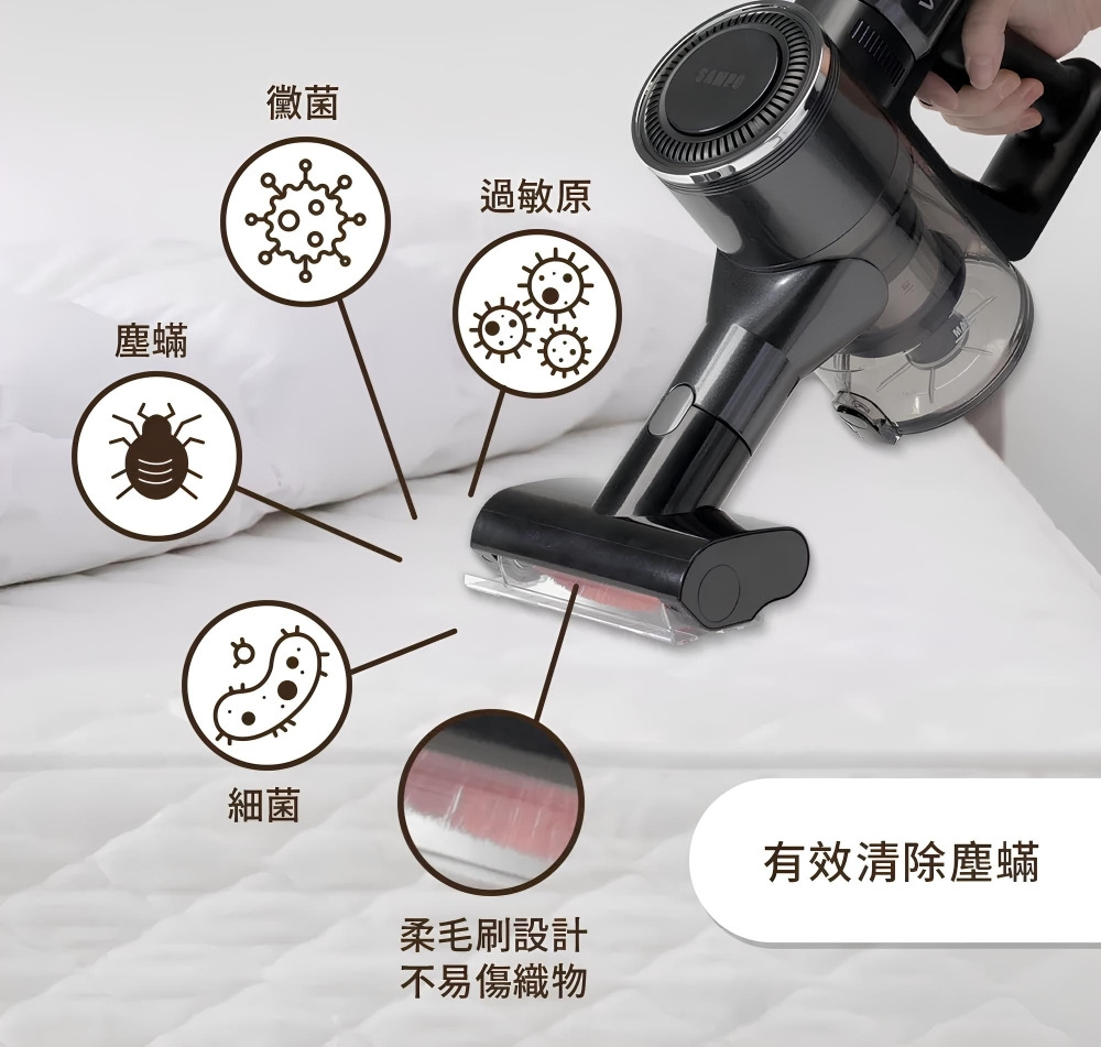 配件:LED電動绒毛地刷、電動除螨刷、金属铝管、 伸缩软管、二合一刷、扁吸嘴、沙發刷、HEPA濾網2個、壁掛固定架、產品收納座
