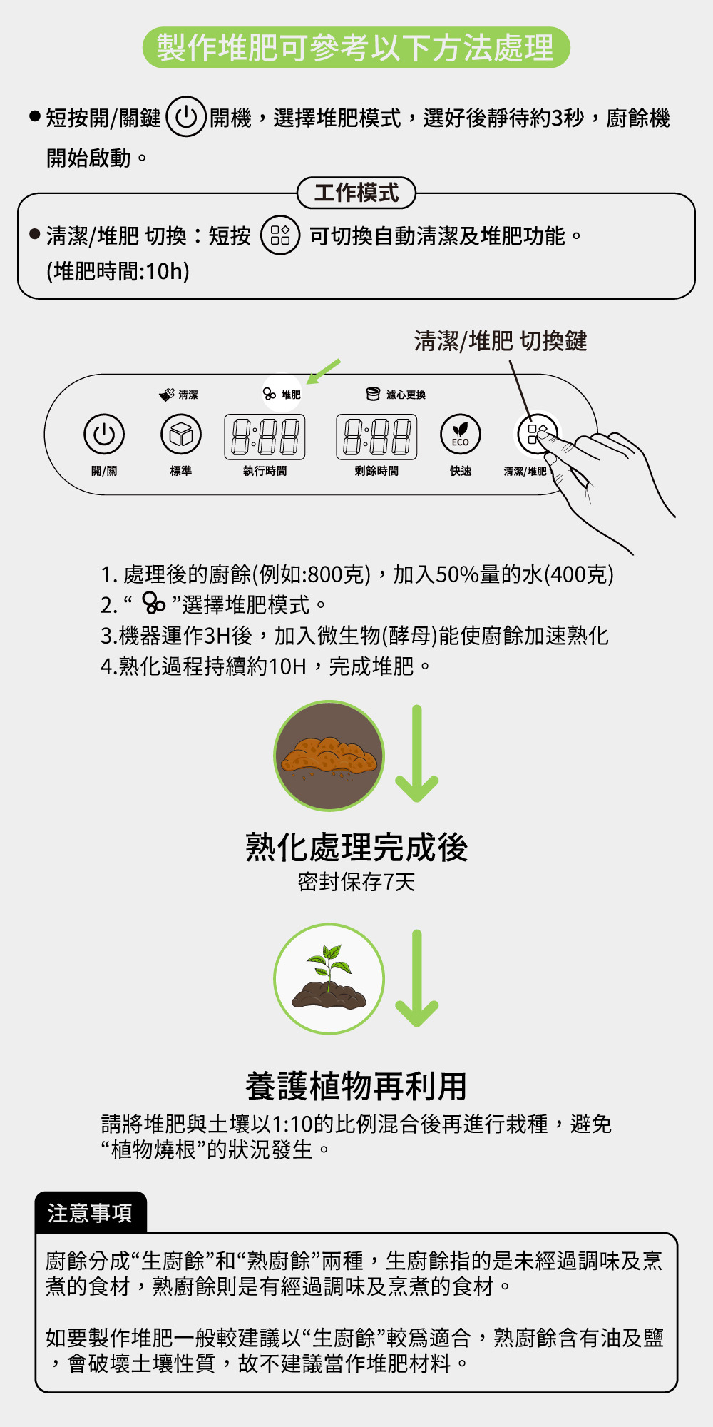 運作時間:標準模式4、5、6h、快速模式1、2、3h、清潔時間30min、堆肥時間10h
