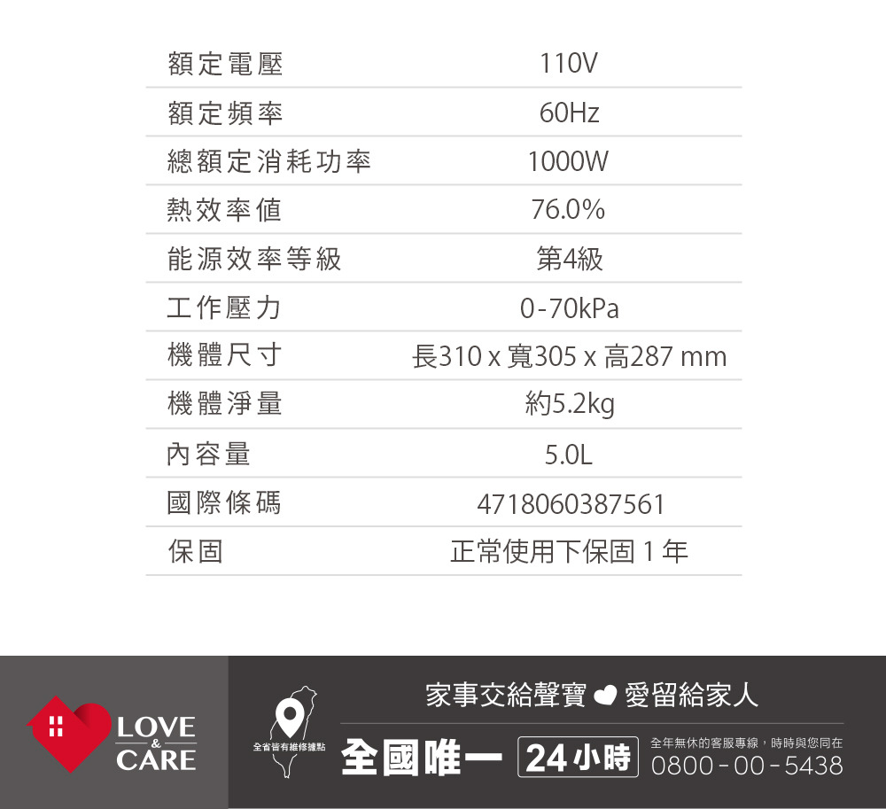 產品重量(含配件):約5.2 公斤