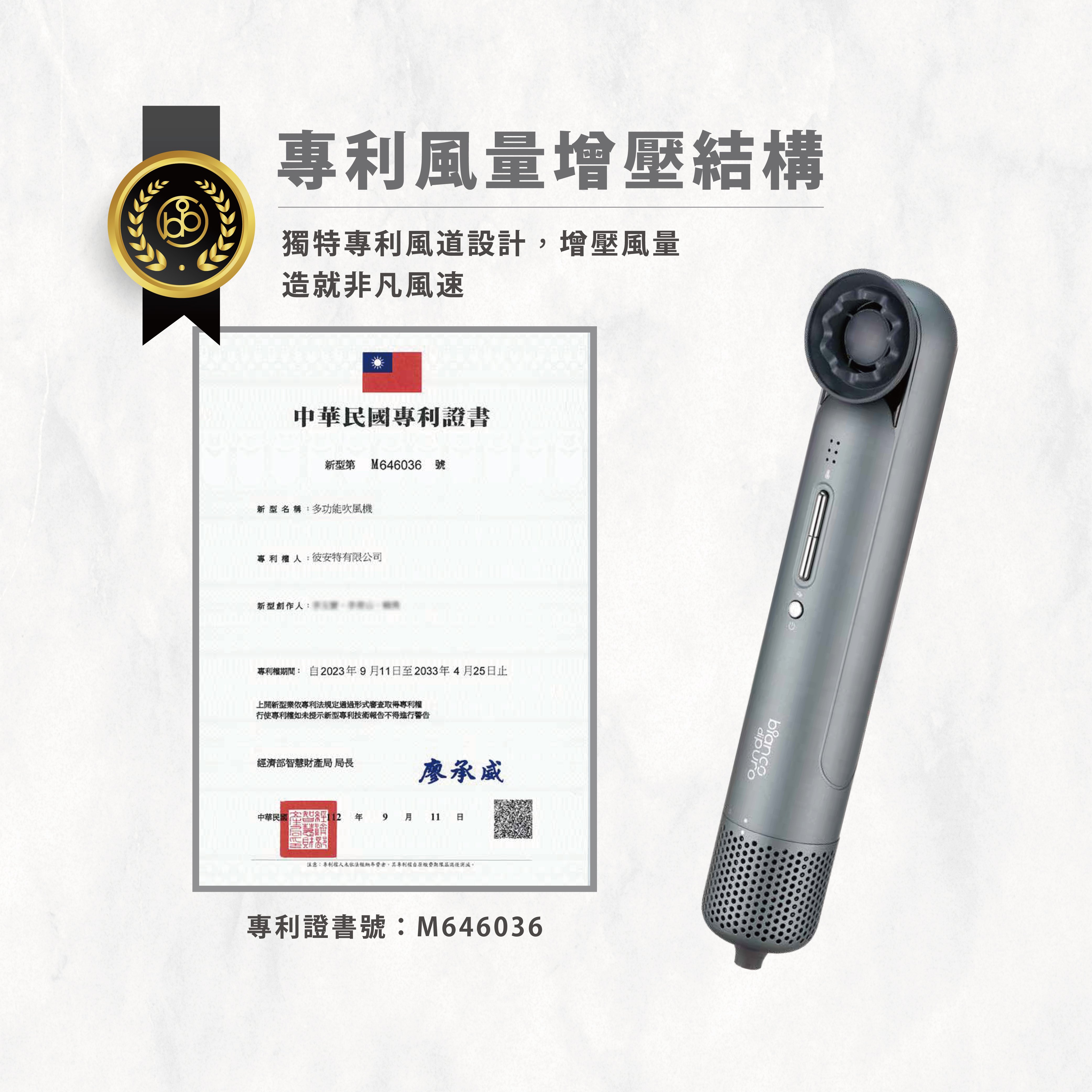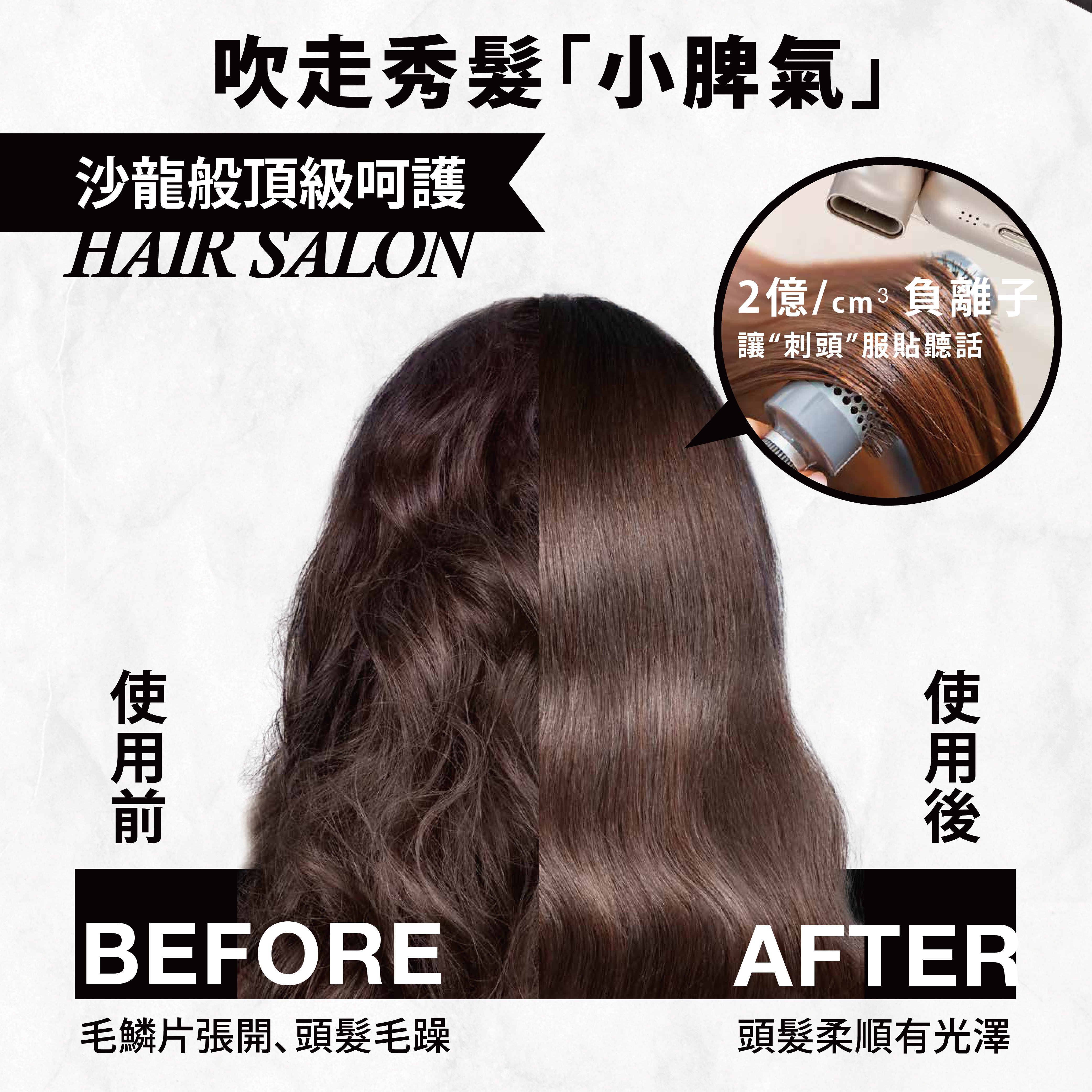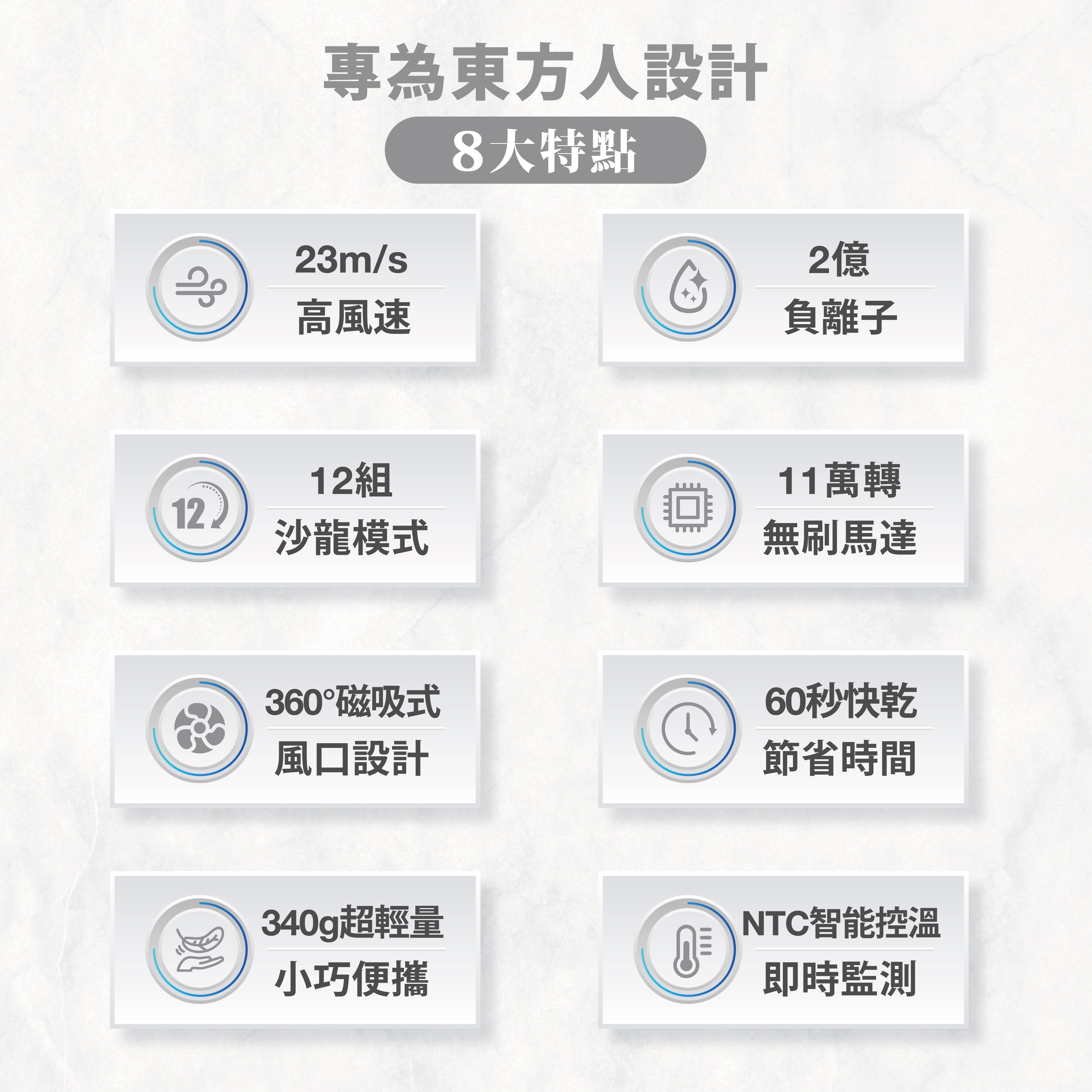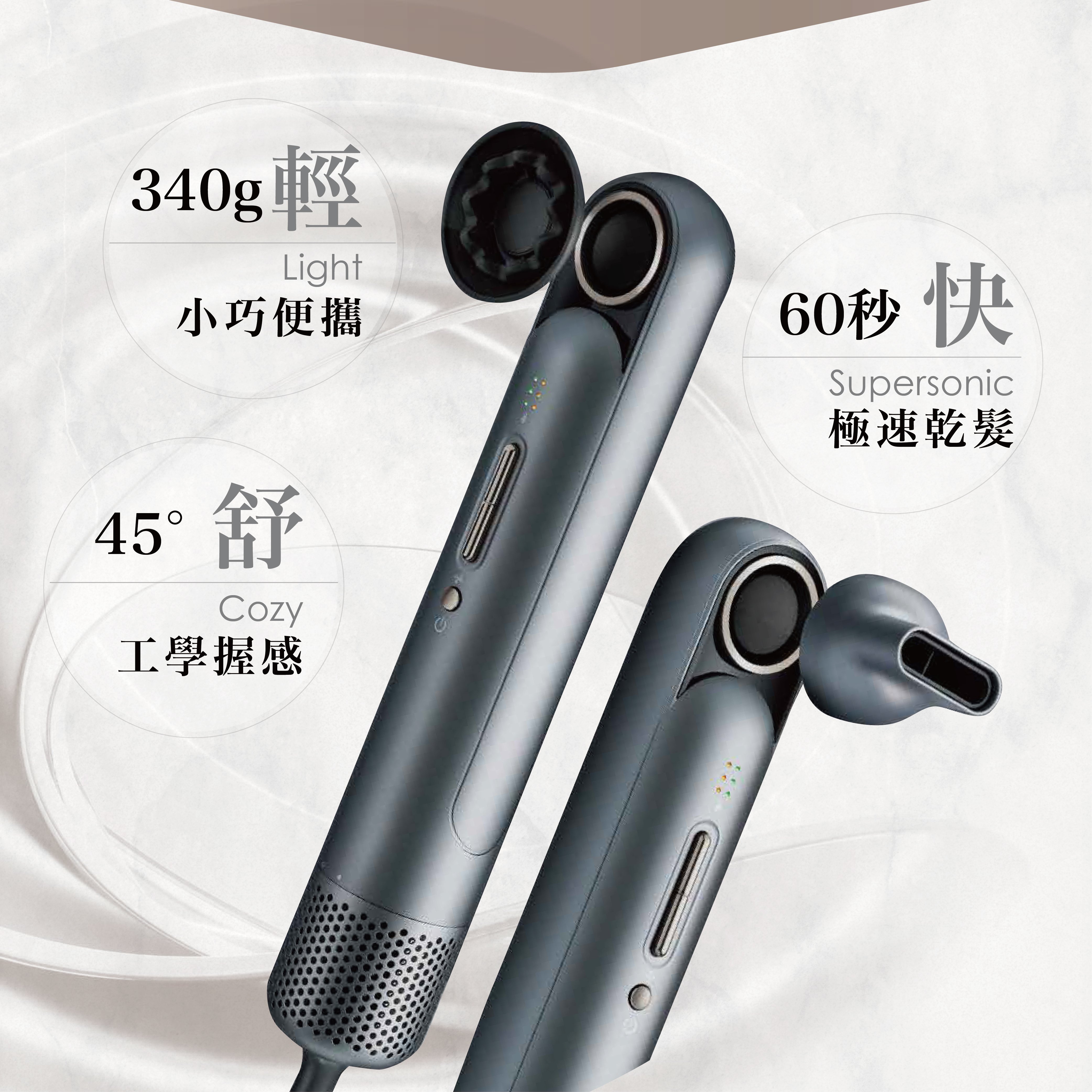 340g 超輕量機身 11萬轉 23 m/s 高風速 創新1字型設計 2億負離子 12種乾髮模式