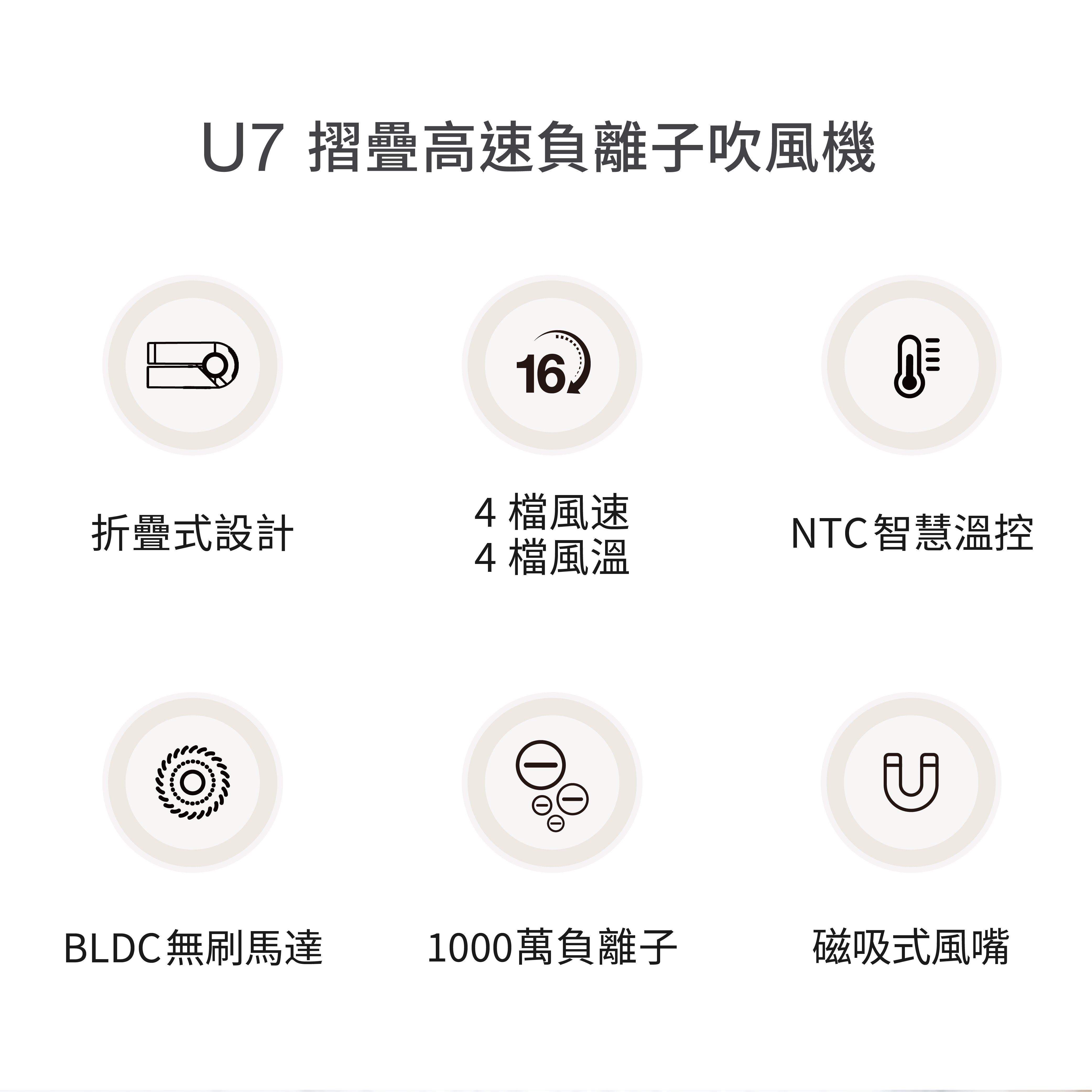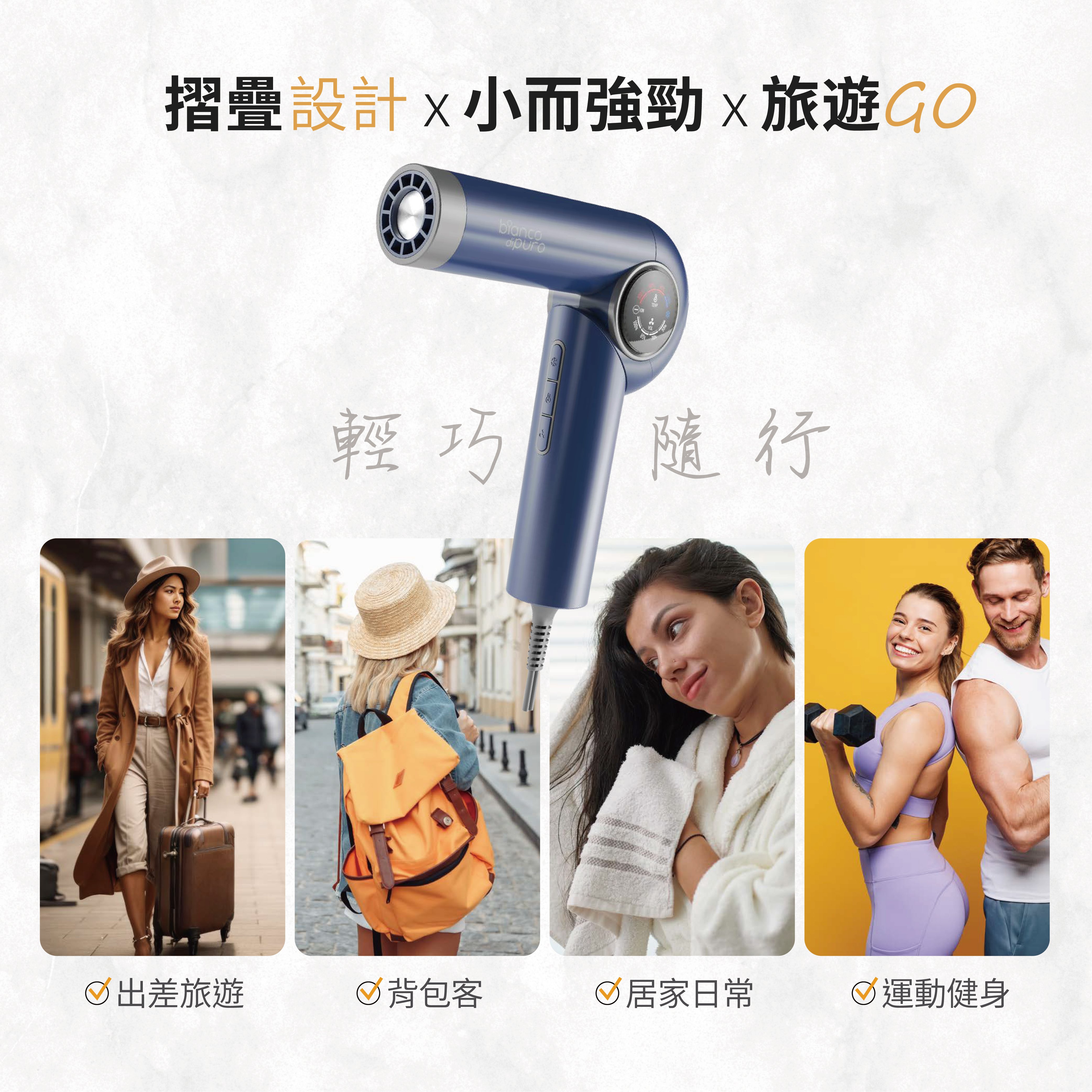 可摺疊設計,外出旅行超方便 11萬轉 DC 無刷馬達 1,000 萬負離子水潤輸出,降低毛躁,呵護頭髮 NTC智能溫控即時監測 340g 超輕量機身 液晶螢幕顯示溫度 16 種吹髮組合(風速 × 風溫)提高自由調整度