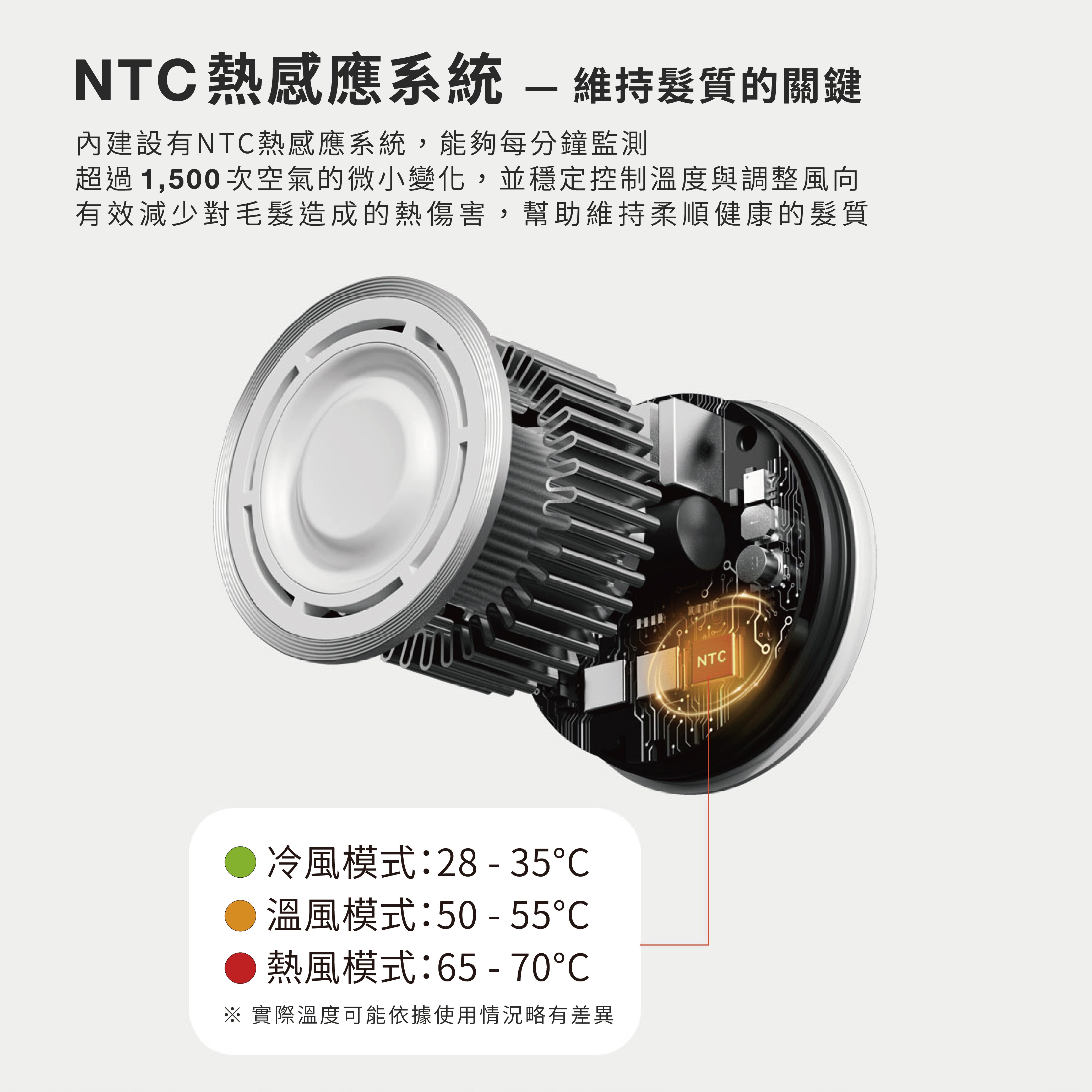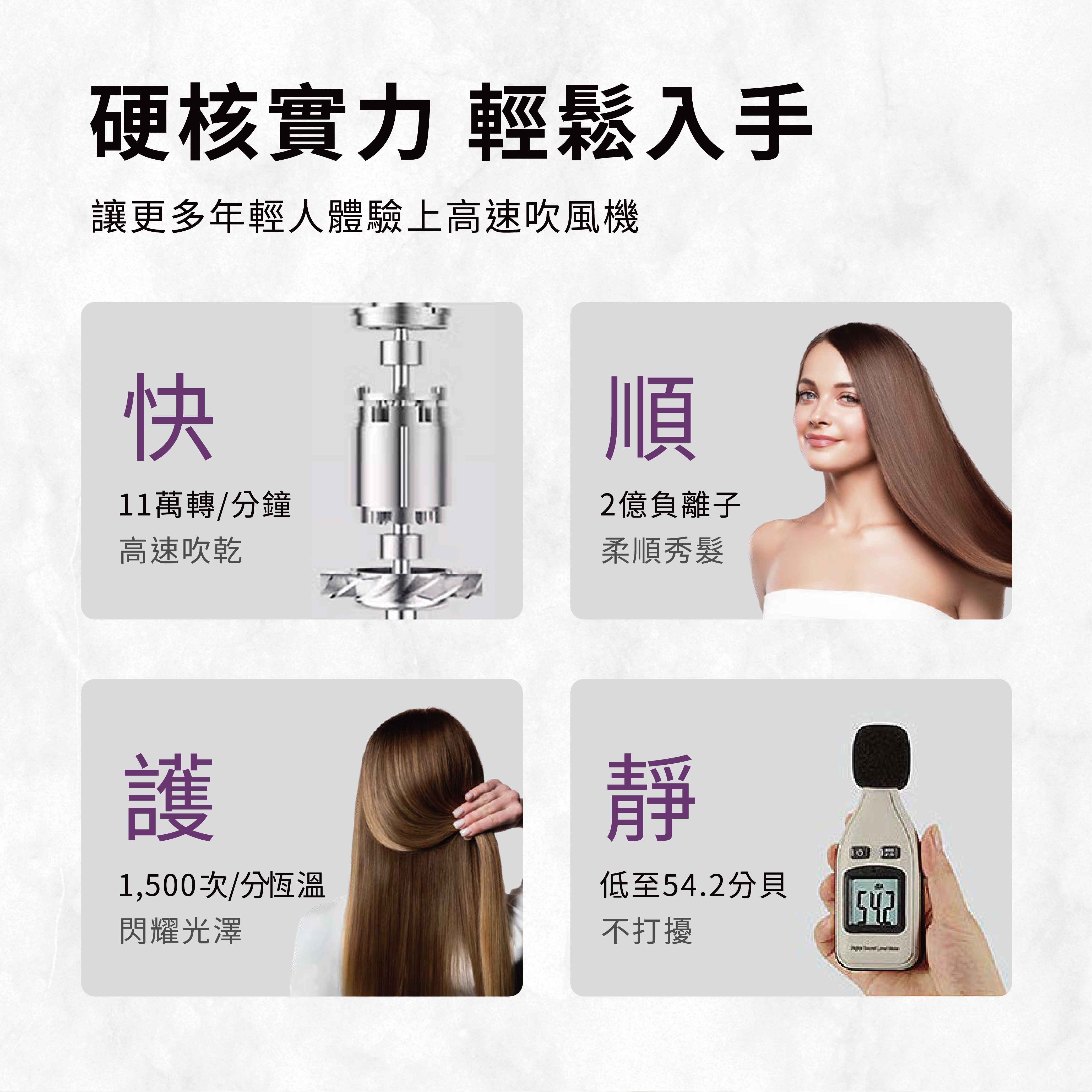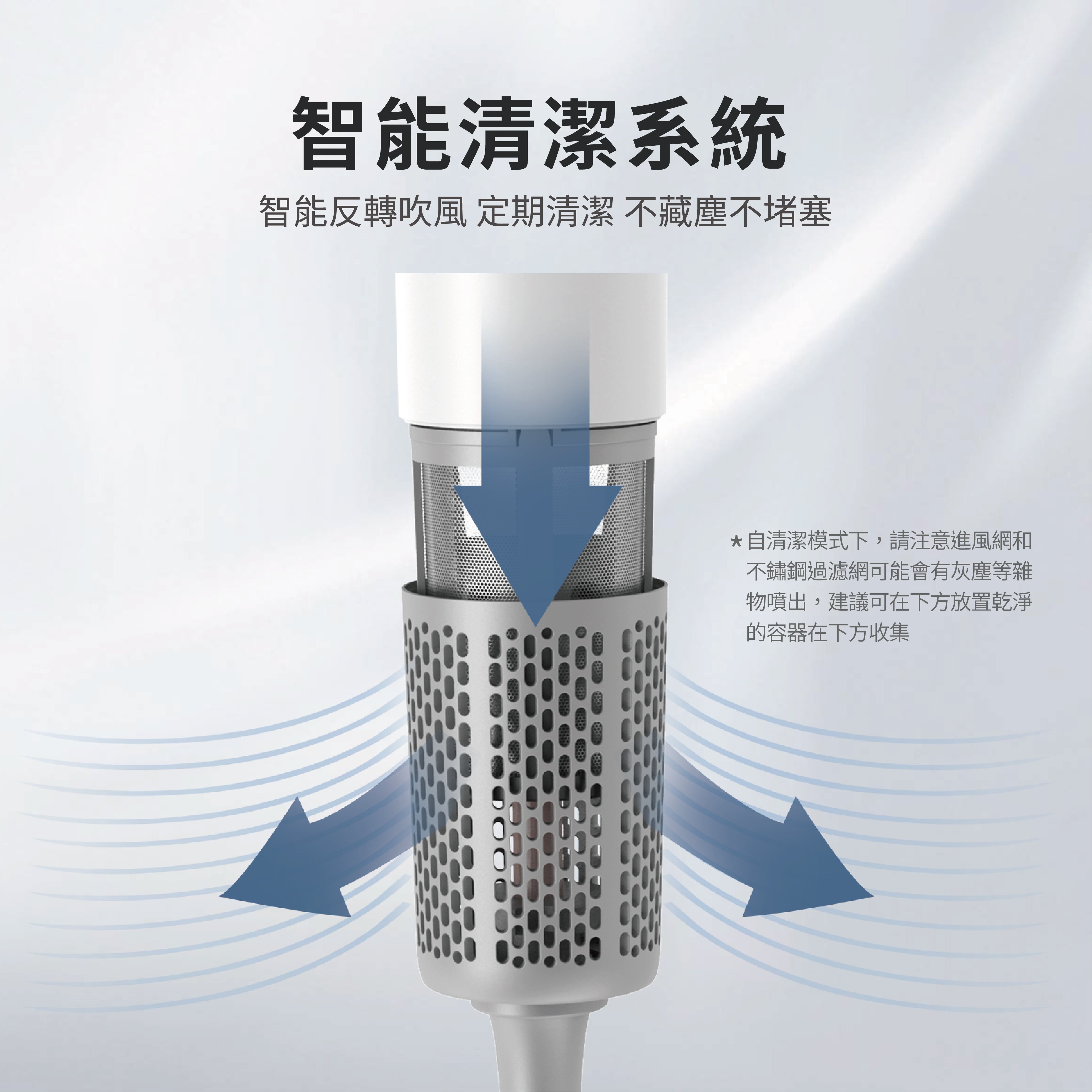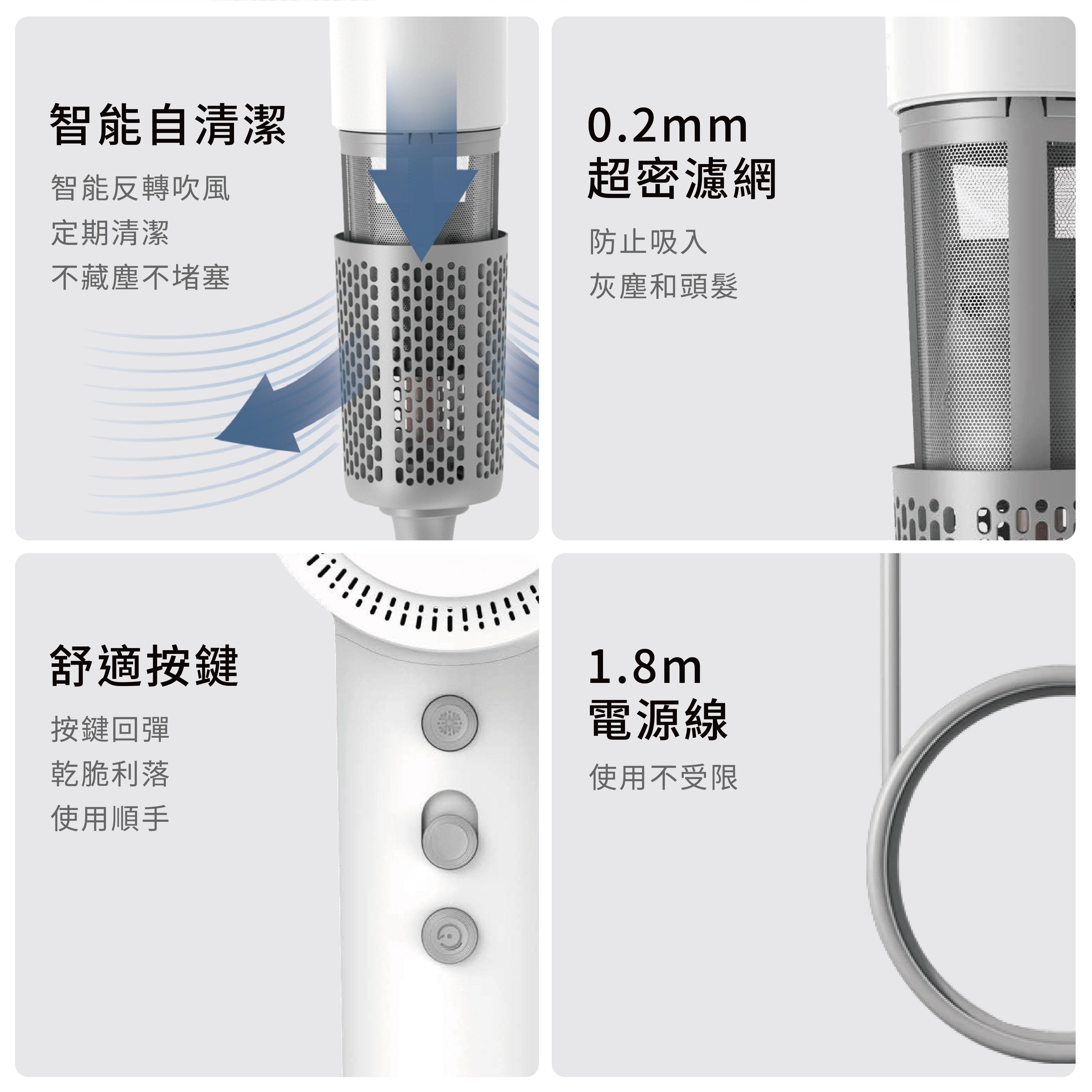 國際全電壓設計 AI智能調節電壓 21 m/s大風量加快乾髮 NTC智慧溫控 富含2億負離子,柔順秀髮 智能自清潔模式 0.2mm超密濾網,防止吸入灰塵和頭髮 54.2分貝,輕音不打擾 360度磁吸式風嘴,一吸就牢,輕鬆更換