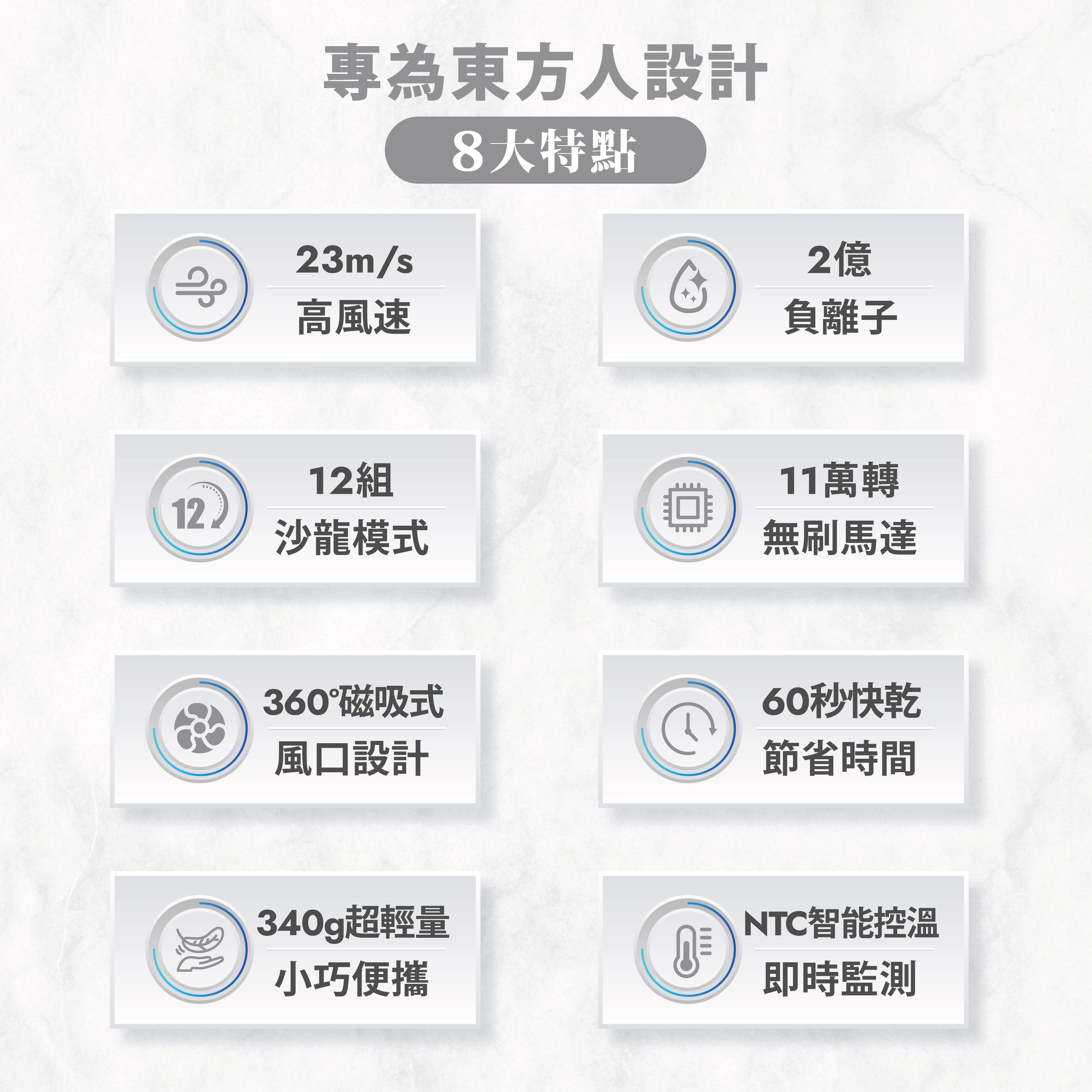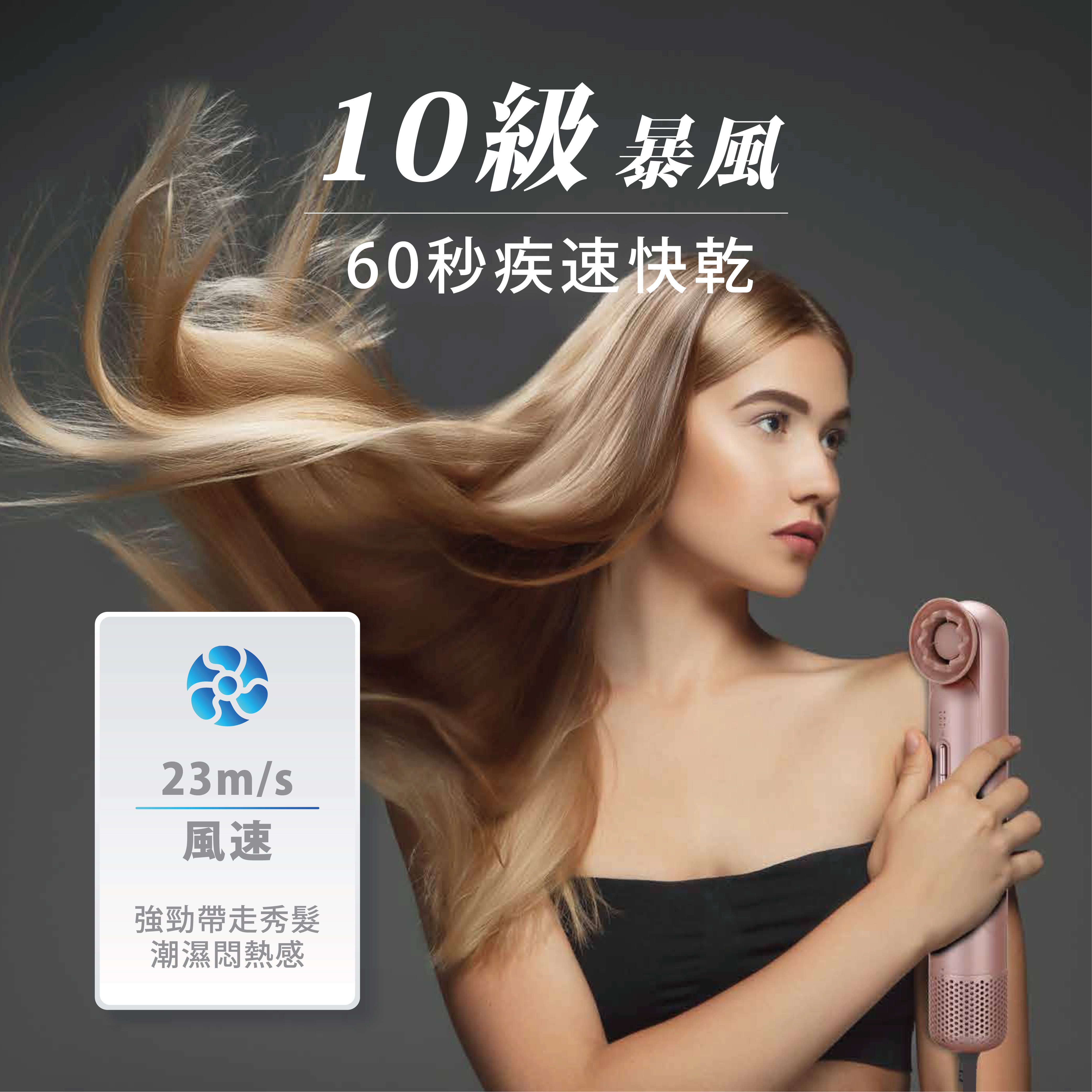 340g 超輕量機身 11萬轉 23 m/s 高風速 創新1字型設計 2億負離子 12種乾髮模式