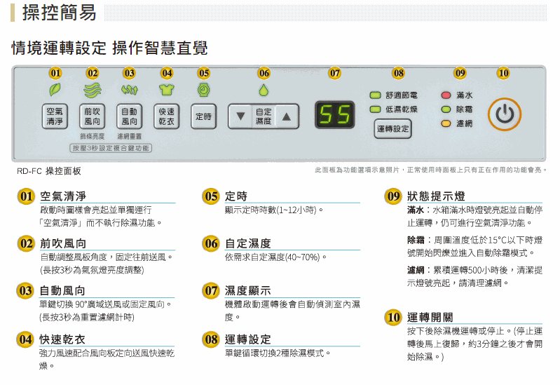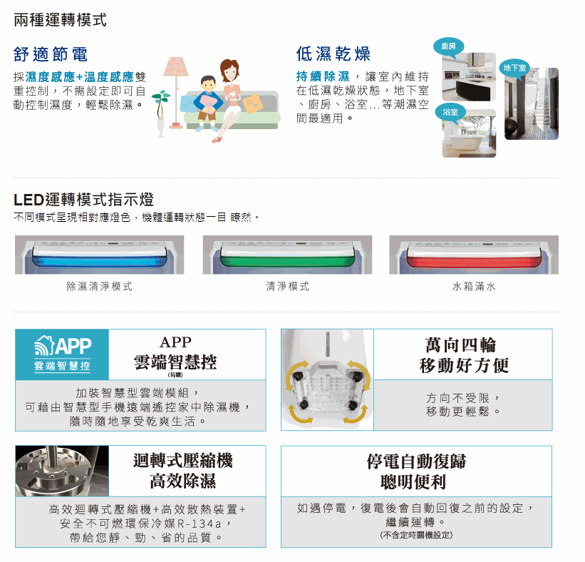 迴轉式壓縮機 環保冷媒R-134a 舒適節電功能 低濕乾燥運轉功能 1-12小時定時關機 自動除霜 濕度顯示/設定