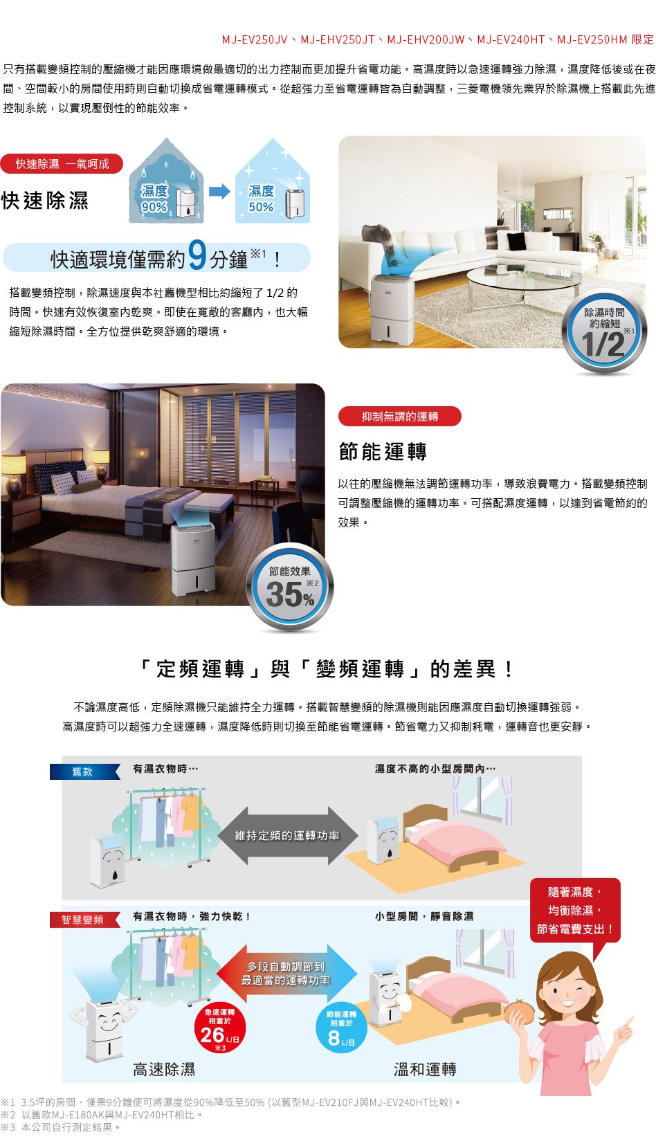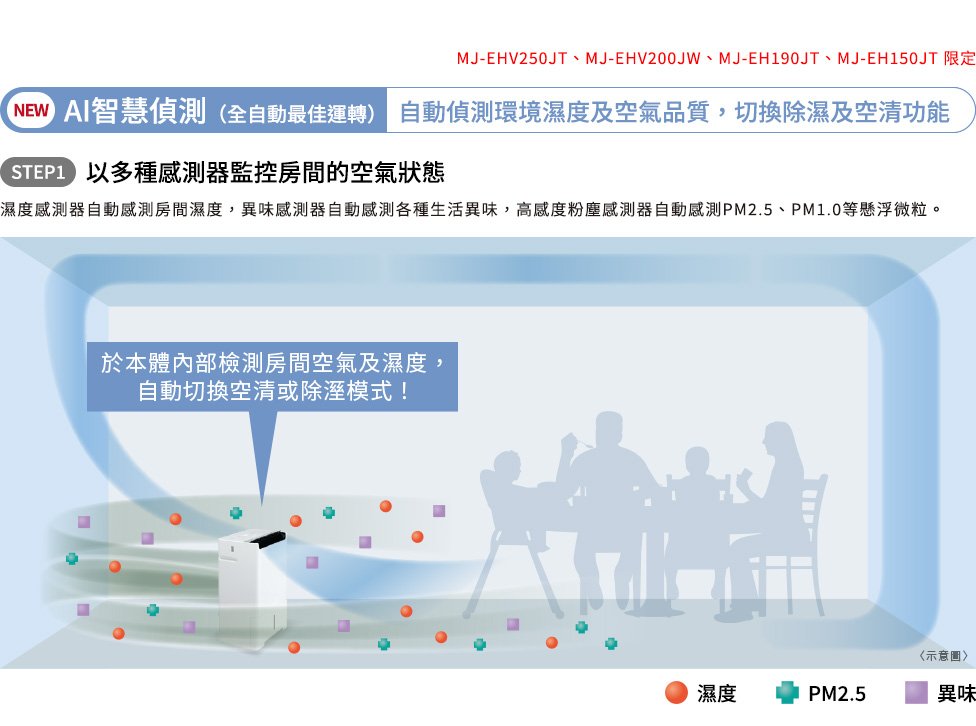 AI智慧偵測 強力除濕x快速空氣清淨x除臭 全自動切換運轉 - 濕度感應器自動感測室内濕度,異味感應器自動感測各種生活異味,高度粉塵感應器則自動感測細微懸浮粒子如PM2.5及PM1.0等,根據空氣狀況,自動切換3種模式。採用獨家三重除濕系統 兼具「除濕力」與「省電力」 - 使用三菱獨家最高規格三重除濕系統,採用新型薄型設計大幅降低冷凝器厚度,不但能維持熱交換面積與效率,也能減少風路阻力,達到靜音與省電的效果。
