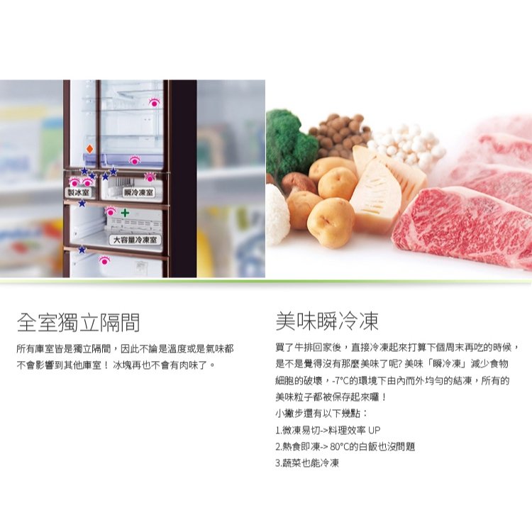 輕鬆拿取上層物品的貼心高度設計! 「超冰保鮮D」、「微凍易切瞬冷凍」經典功能全搭載 三菱的兩大堅持!全室獨立空間+靜音15dB 多種獨家技術,貼心實用設計 美味不妥協,頂級藏鮮再升級 兼具 大容量與美型雙重要求