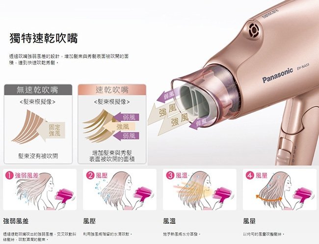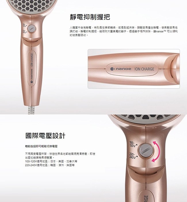 Nanoe 奈米水離子 速乾吹嘴 靜電抑制機能 2段風量/3段溫度 雙電壓設計 小巧機身摺疊好攜帶
