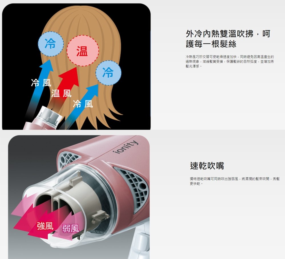 溫冷雙風設計讓秀髮直順有光澤感雙負離子出口加倍保濕秀髮