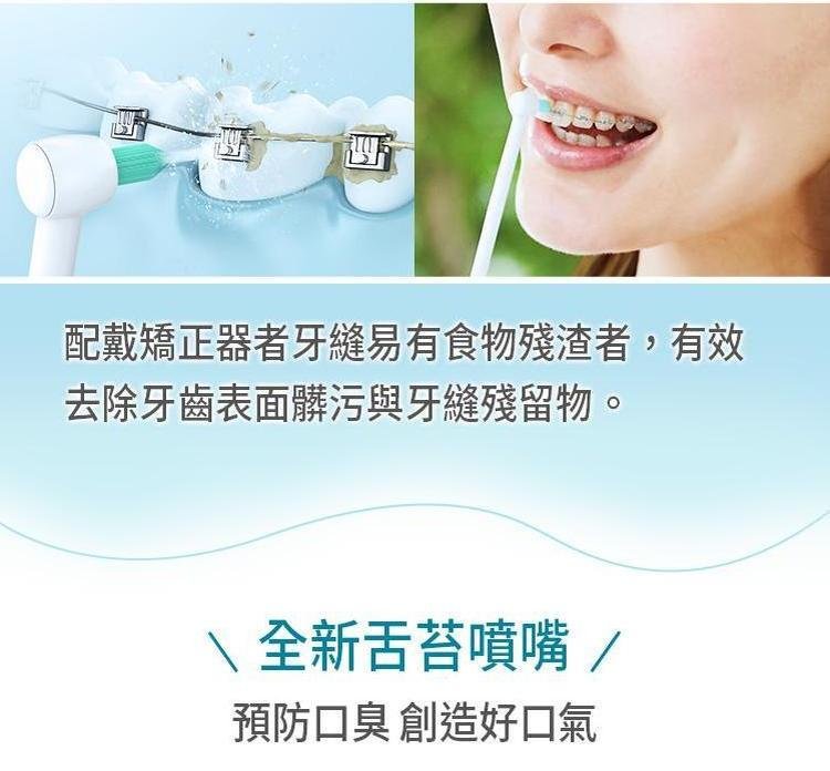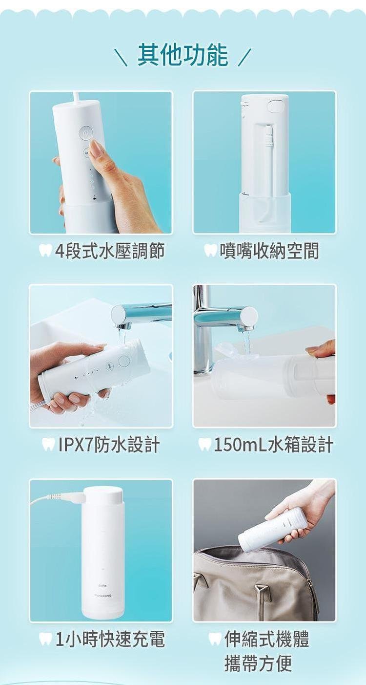 搭載噴射水流-除了可沖洗牙縫外,更可柔和按摩牙齦。150mL水箱/4段強弱水流調整-可依個人使用需求選擇適合的水壓強度