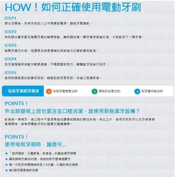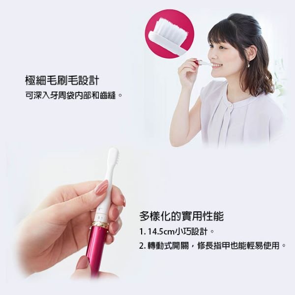 音波震動- 每分鐘16,000 次的音波震動,溫和清潔牙齒牙縫 極細毛刷頭 深入牙周袋清潔 輕巧設計 轉動式開關