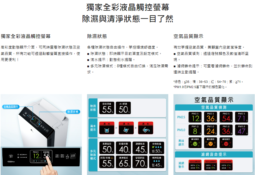 變頻壓縮機+W-HEXS雙重除濕系統全彩液晶觸控螢幕