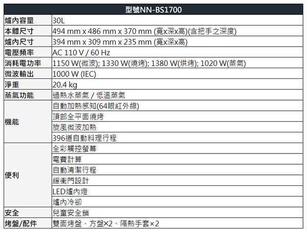 Panasonic 國際牌30L平台式變頻蒸烘烤微電腦微波爐NN-BS1700