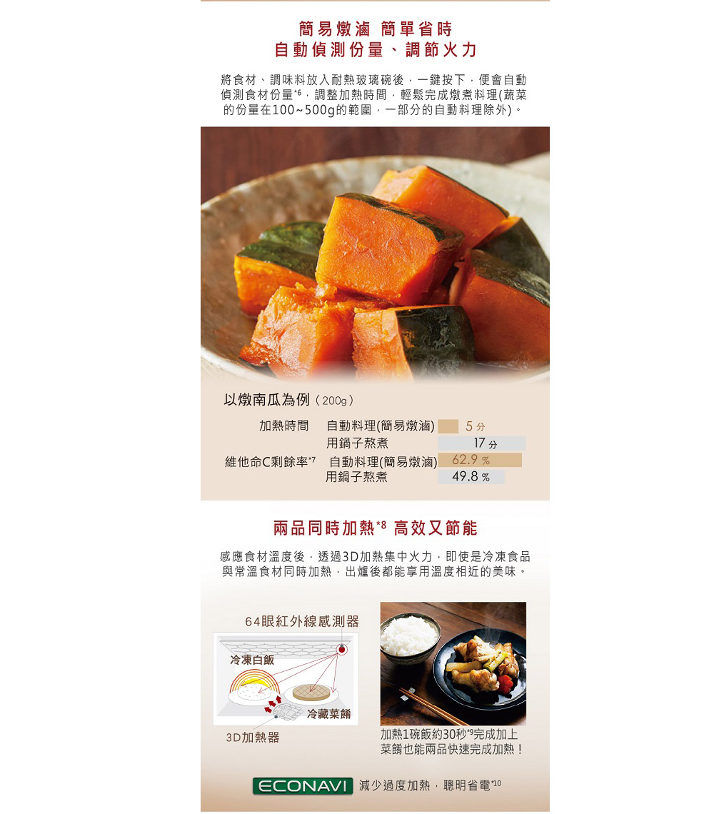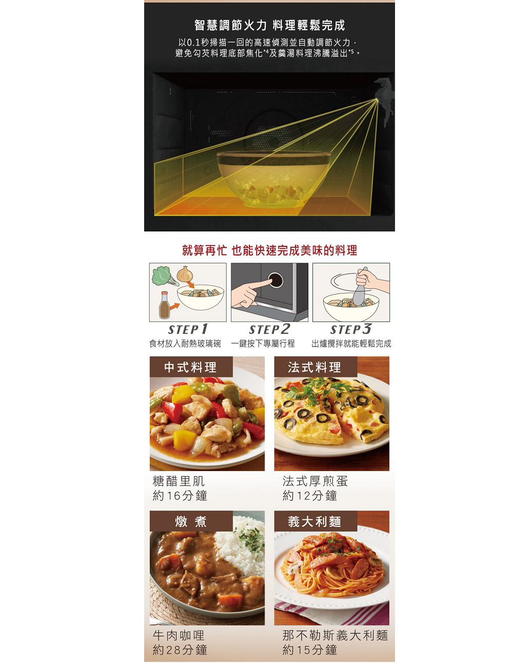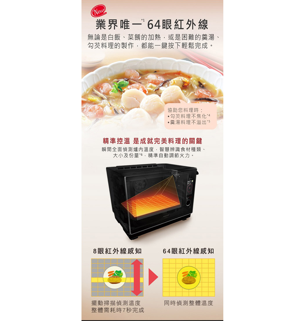 64眼紅外線溫控科技,業界唯一,瞬間偵測食材溫度,精準加熱旋風微波加熱技術,業界首創,由內而外,快速均勻加熱