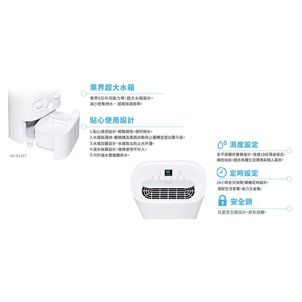 除濕能力:8L/日 / 7公升水箱 (水滿6.0L)1 -24小時開 /關機設定 / 13段濕度設定