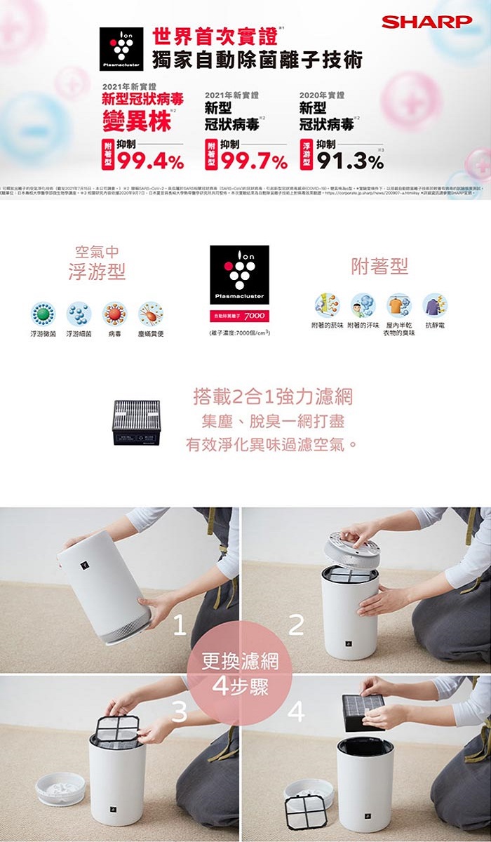 適用坪數:約 ~3坪搭載夏普獨家高濃度自動除菌離子7000