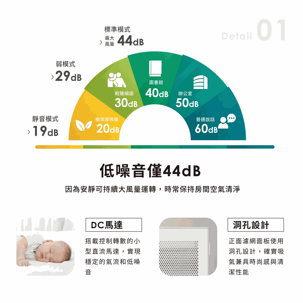 最大風量運轉僅44dB,靜音模式19dB超安靜。