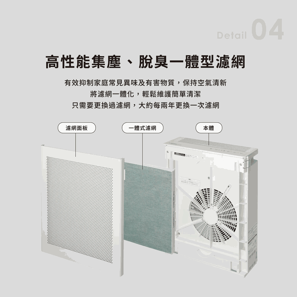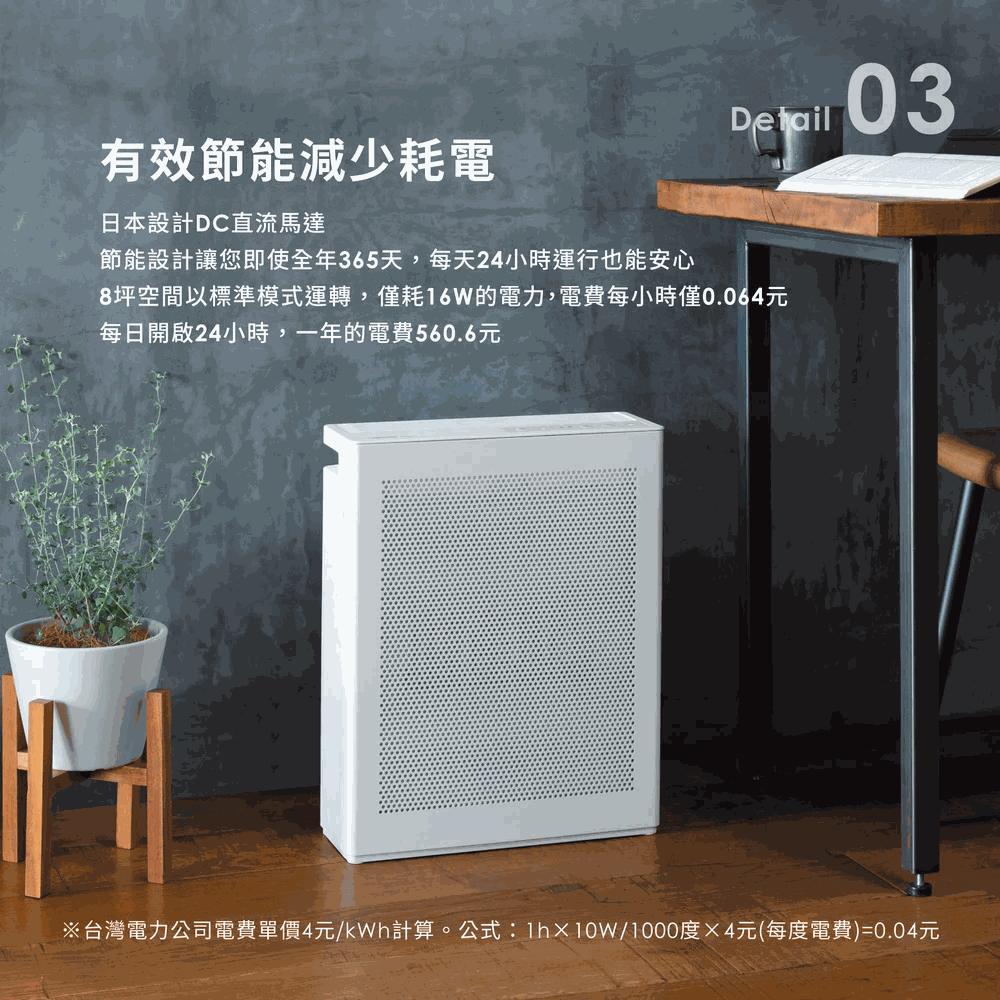 靜音模式19dB/最大風量運轉44dB 超輕巧體積,放置不困擾 高性能集塵脫臭一體型濾網 薄型12.5cm超輕巧體積,徹底清淨8坪空間。 最大風量運轉僅44dB,靜音模式19dB超安靜。 「正面面板」全面高效吸引清淨。 只需更換「高性能集塵脫臭一體型濾網」輕鬆清潔。 空氣感測器隨時檢知室內灰塵狀況。 「DC直流馬達」24小時365天有效節能運轉。